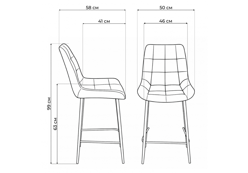 Материал каркаса - металл; Материал сиденья - велюр; Материал обивки - велюр; Ширина - 50; Глубина - 58; Высота - 99; Ширина сиденья - 46; Глубина сиденья - 41; Высота сиденья - 63;