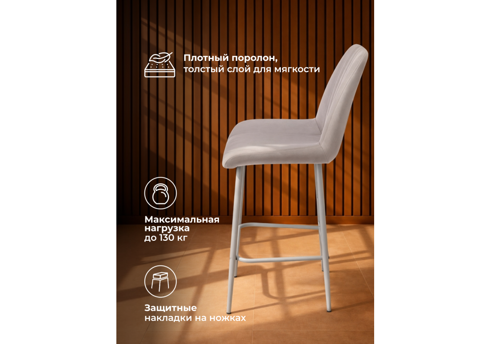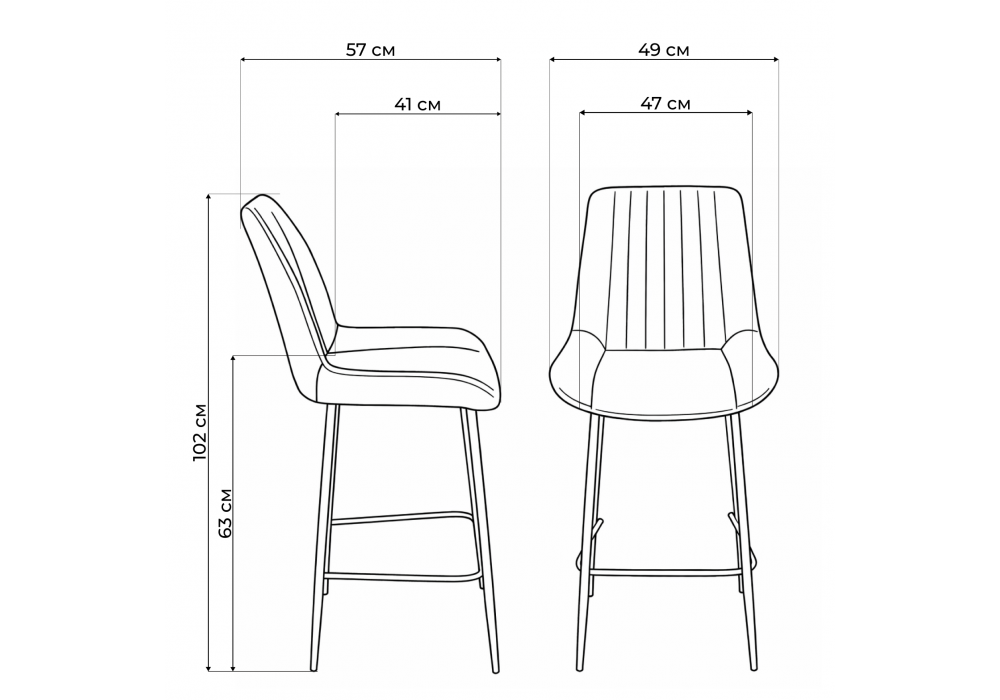 Материал каркаса - металл; Материал сиденья - велюр; Материал обивки - велюр; Цвет ножек - серый; Ширина - 49; Глубина - 57; Высота - 102; Ширина сиденья - 47; Глубина сиденья - 41; Высота сиденья - 63;