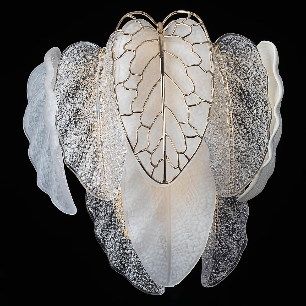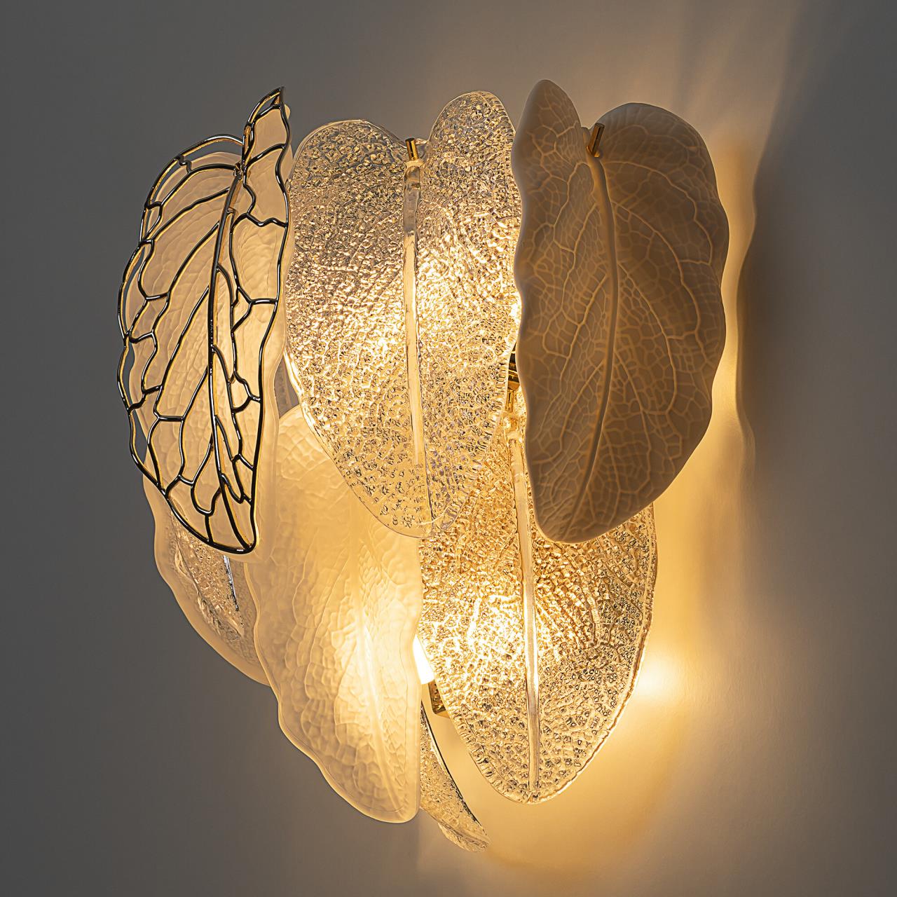 Металлический каркас золотистого оттенка переливается в лучах света, вступая в гармоничный союз с листьями из матового и прозрачного стекла и керамики. Металлические листья-подвески отлиты по ювелирной технологии, что подчёркивает изысканность и чёткость флористического рисунка. В изделии используется 5 лампочек с цоколем G9, тип крепления светильника — планка.