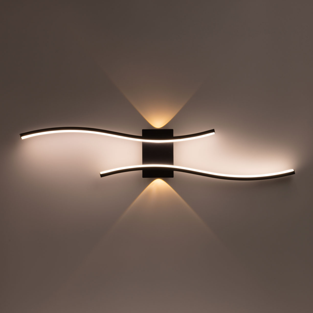 Металлическое основание настенного бра окрашено в черный цвет. Плафоны выполнены из сплава алюминия и окрашены в черный цвет. Светодиодные источники света закрыты белым матовым силиконом и прозрачным акрилом.