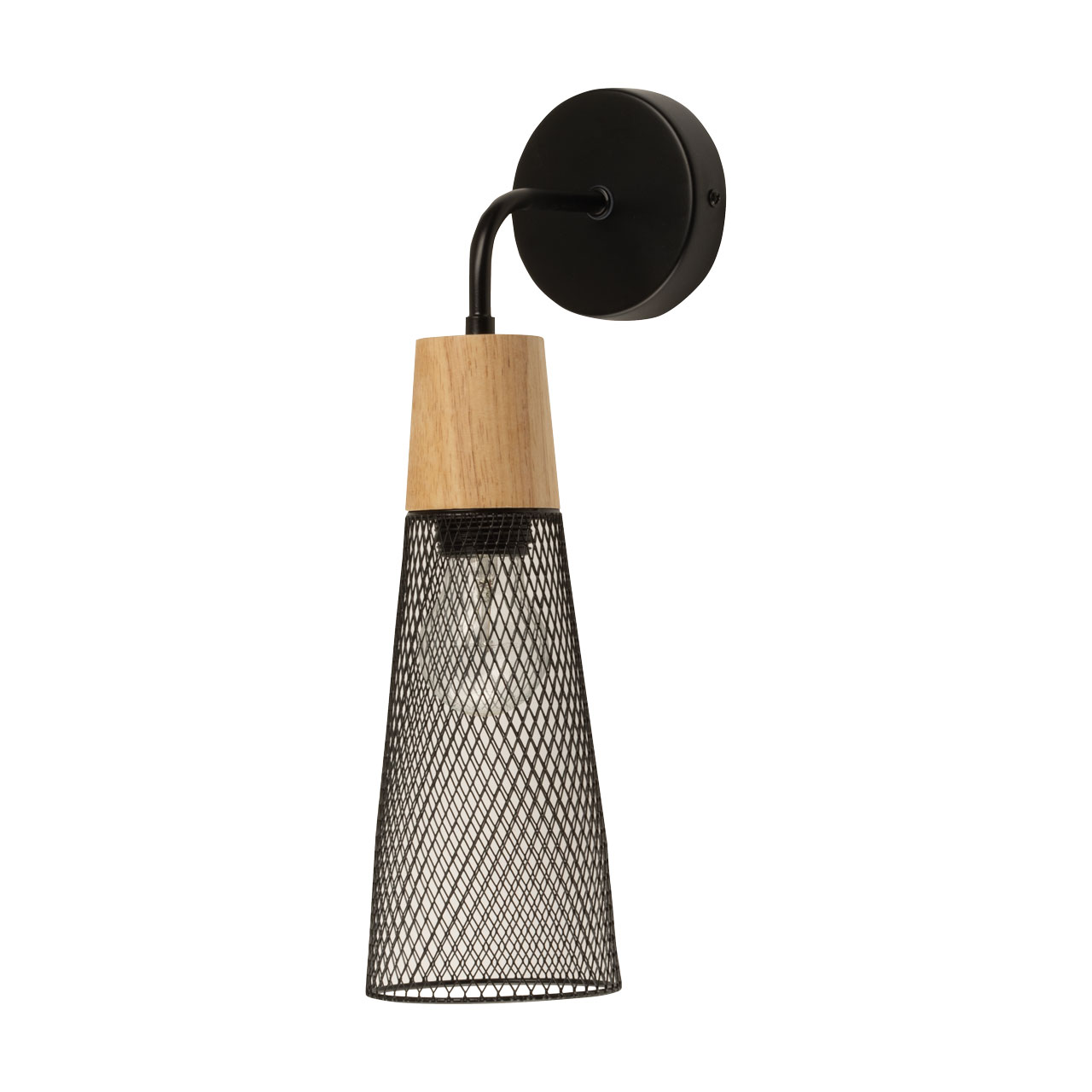 Металлическое основание и плафон бра окрашены в черный цвет. Декоративный элемент выполнен из металла с имитацией под натуральное дерево.