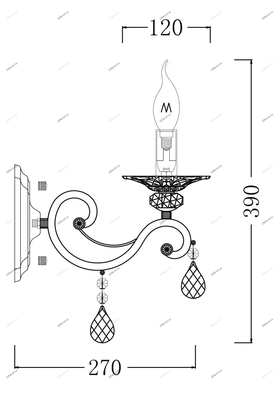 Абажур бра выполнен из белой органзы, а арматура, украшенная хрустальными подвесами и шарами, изготовлена из белого металла. В светильнике предусмотрено одна лампа накаливания с типом цоколя Е14 и мощностью 40 Вт каждая. Общая мощность составляет 40 Вт, что обеспечивает комфортное освещение на площади до 3 квадратных метров. Бра крепится на стену на планку и имеет размеры: ширина — 14 см, высота — 39 см, длина — 28 см. Расширенная гарантия на товар составляет 18 месяцев.