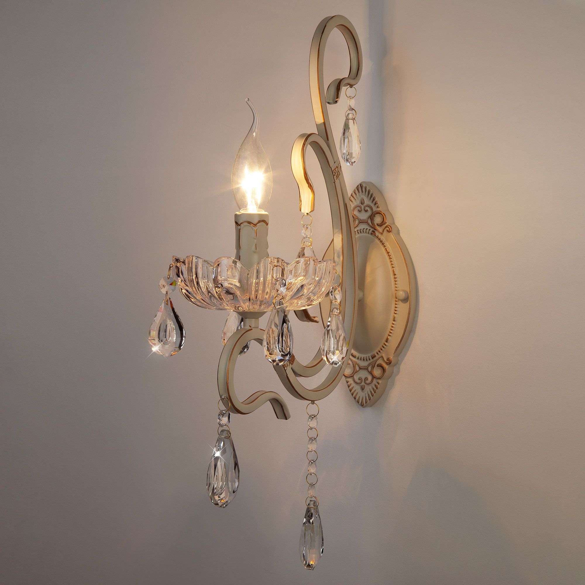 Бра с хрустальным декором 12205/1 станет ярким световым акцентом в классических интерьерах и создаст качественное освещение на площади 3 м². Изящные чаши подсвечников украшены хрустальными подвесками, которые искрятся в лучах света, наполняя помещение выразительным блеском. В качестве источника света используются сменные лампы типа свеча на ветру с цоколем E14. Патрон рассчитан на максимальную мощность ламп накаливания 40 Вт.