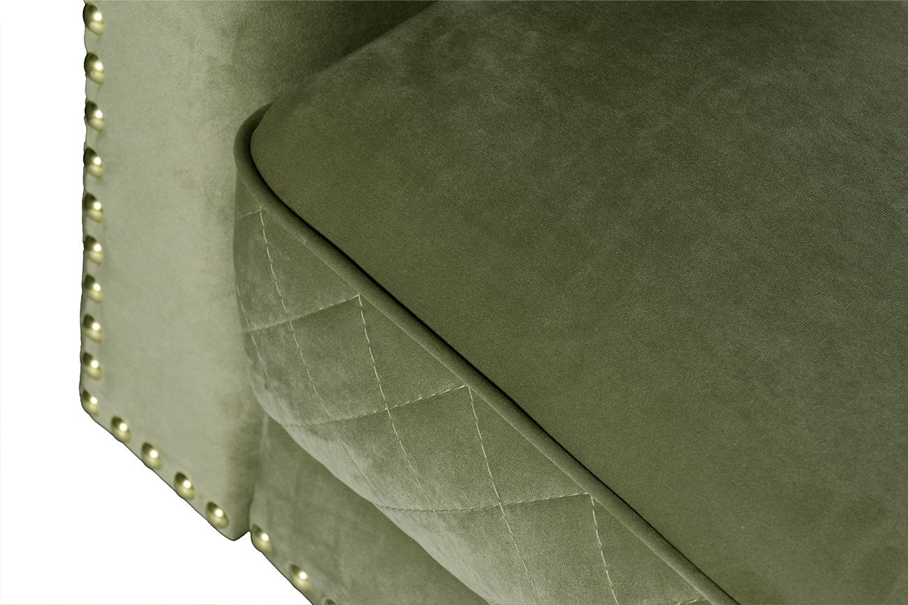 В стандартном исполнении: обивка в ткани из коллекции Garda Decor- велюр Colt1002-OLIV, цвет ножек - 4, колесная опора - нет, гвозди большие, цвет золото.
