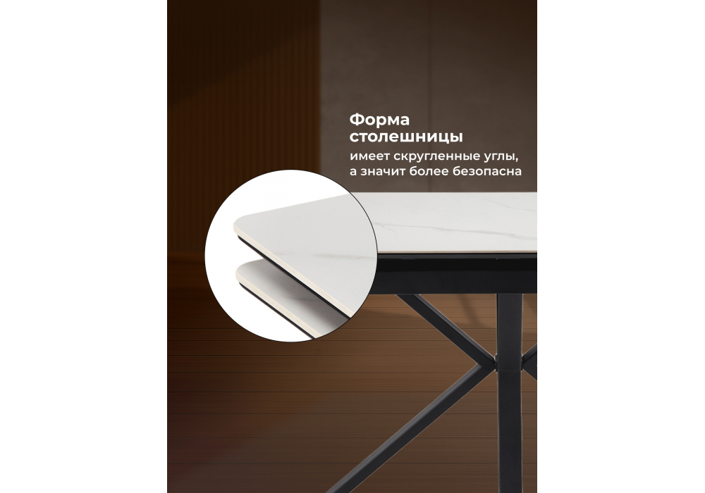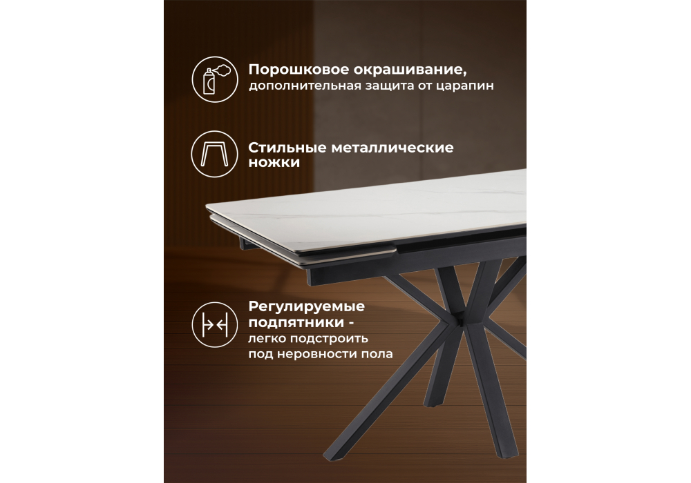 Материал каркаса - металл; Материал столешницы - Керамика; Цвет ножек - черный; Ширина - 80; Высота - 75; Длина стола в разложенном виде - 200; Длина - 140;