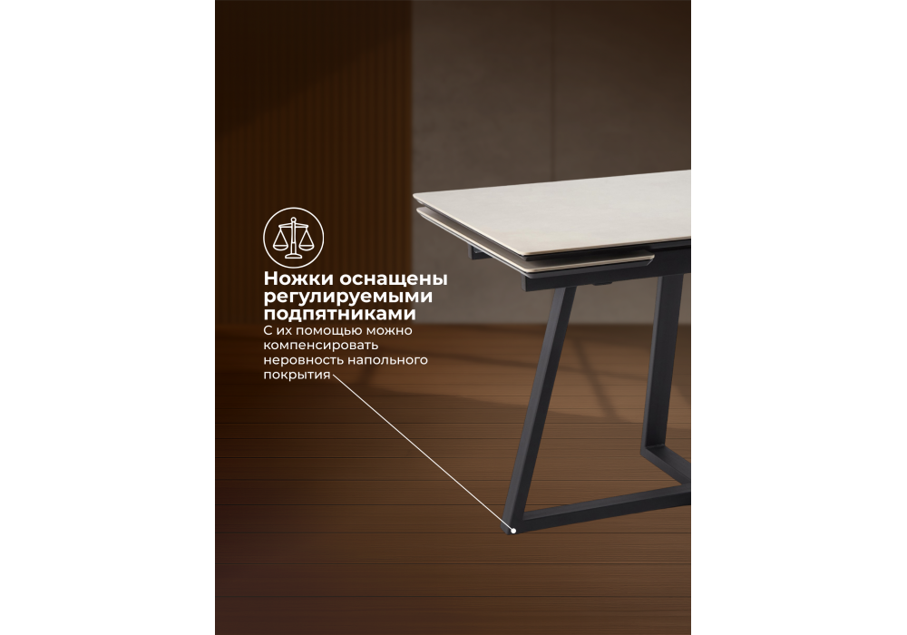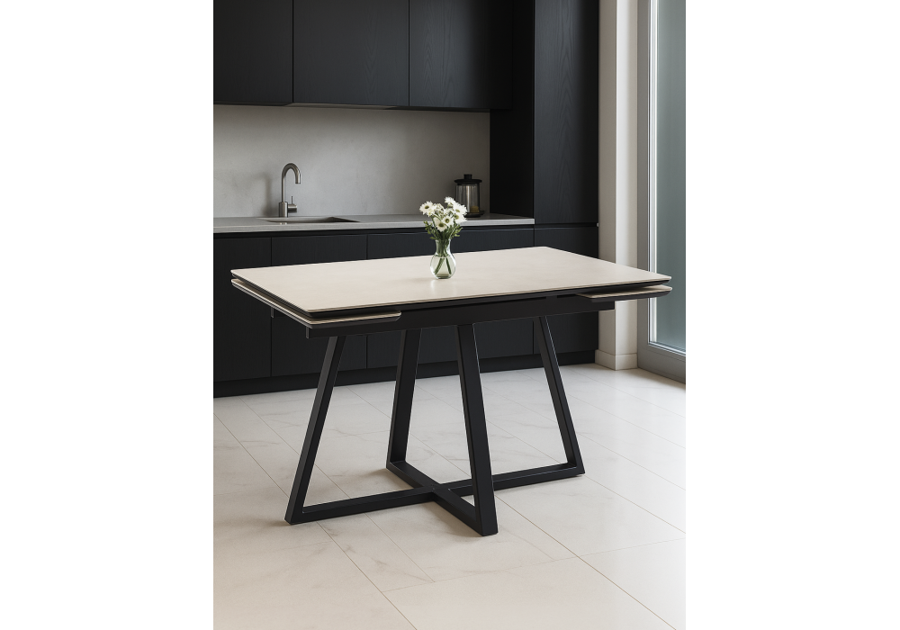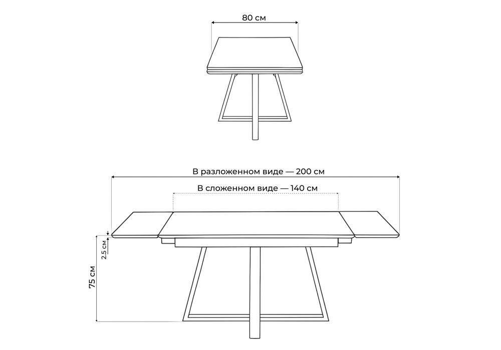 Материал каркаса - металл; Материал столешницы - Керамика; Цвет ножек - черный; Ширина - 80; Высота - 75; Длина стола в разложенном виде - 200; Длина - 140;