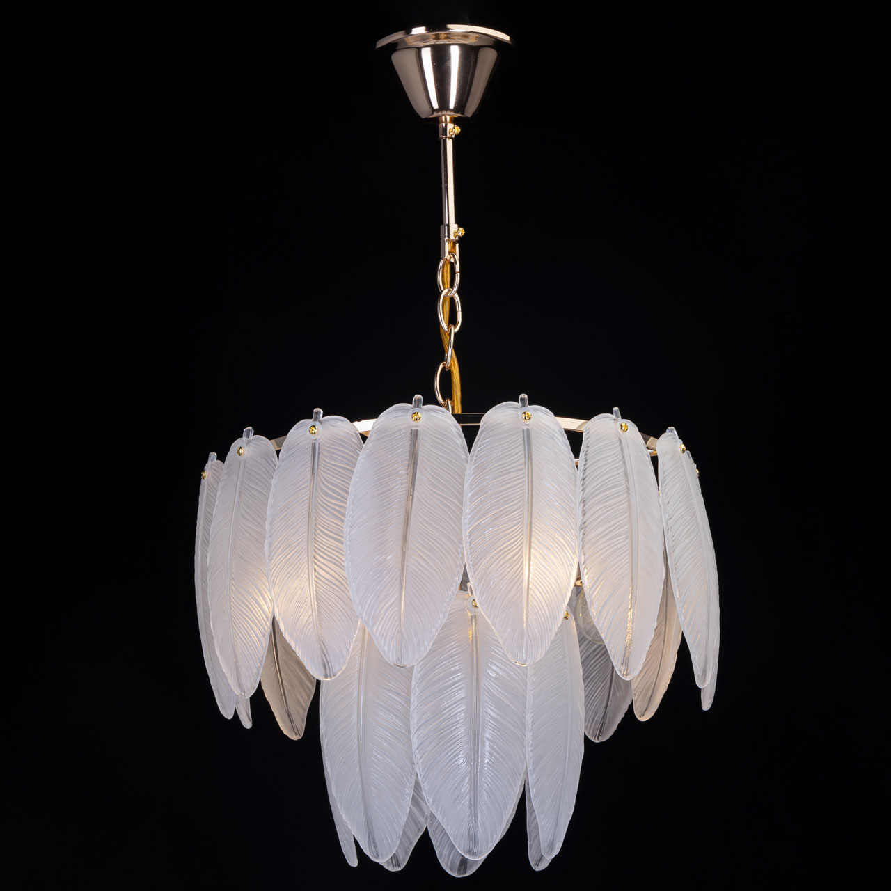 Металлическое основание светильника гальванизировано в цвет золота. Люстра декорирована матированными стеклянными элементами в форме листьев.