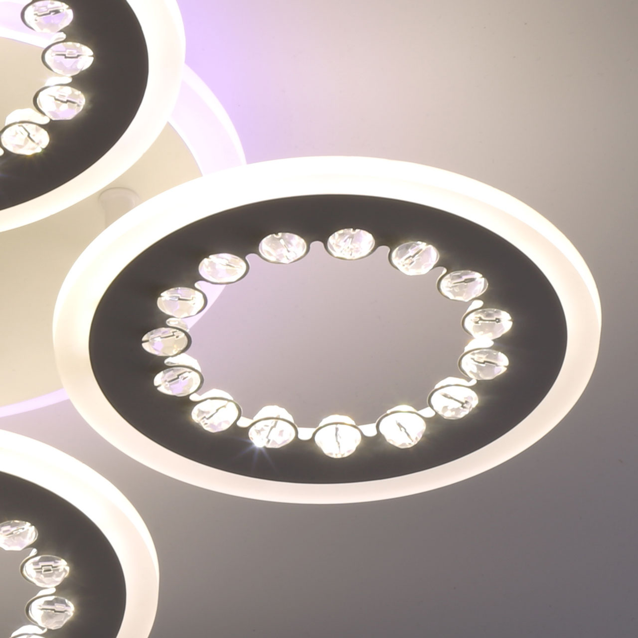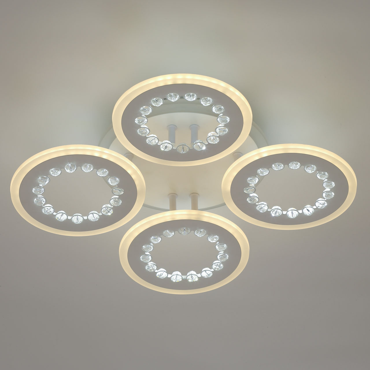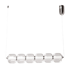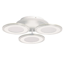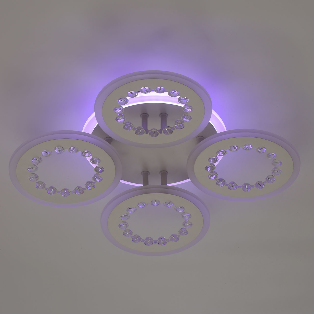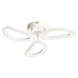 Металлическое основание и плафоны потолочной люстры окрашены в белый цвет. Светодиодные источники света закрыты белым матовым акрилом. Потолочная люстра декорирована бусинами из прозрачного акрила. Дополнительно, в светильнике предусмотрена подсветка потолочной чаши. Светильник приходит в состоянии частичной сборки в компактной упаковке: вся электрика подсоединена, достаточно закрепить плафоны на корпусе.