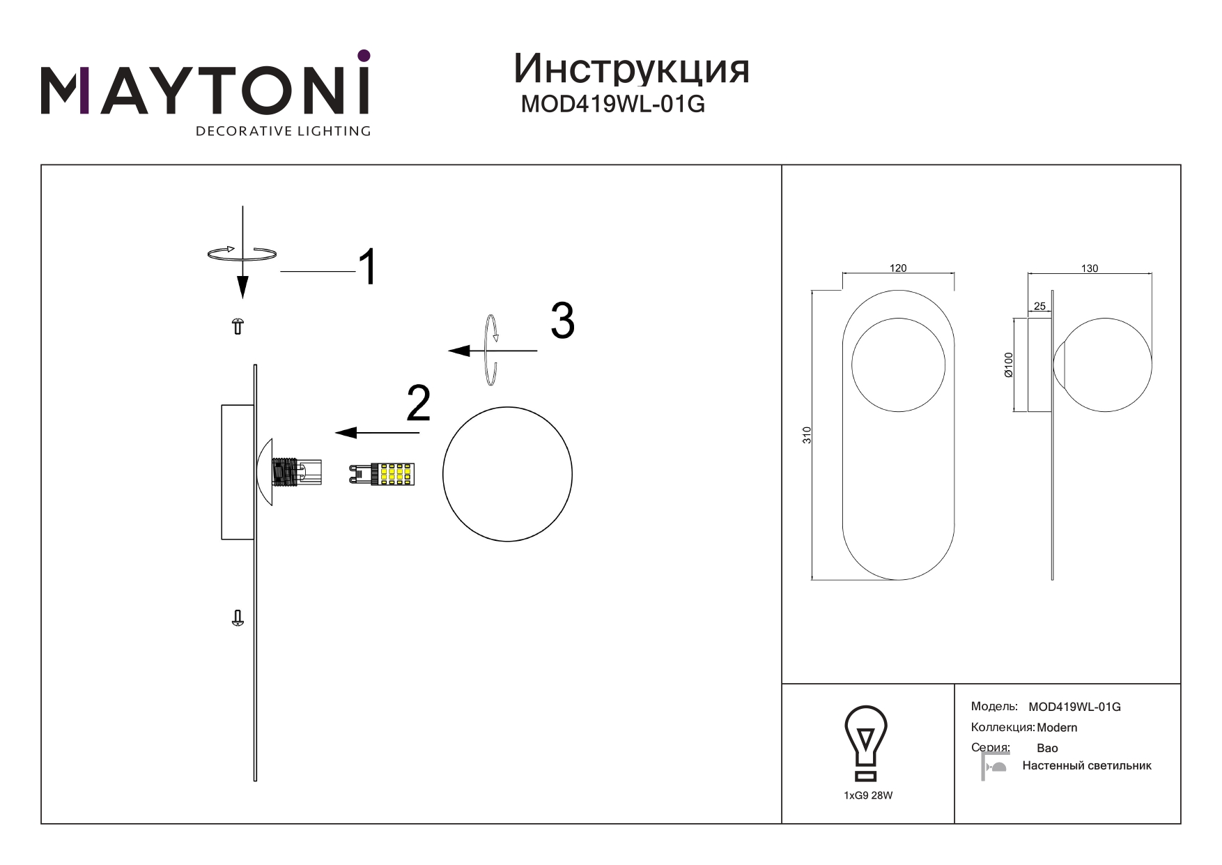Купить "Настенный светильник Maytoni Bao MOD419WL-01G"
