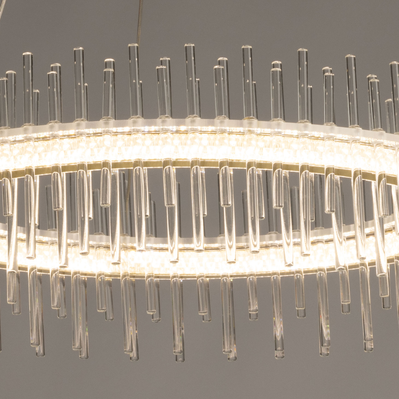 Металлическое основание подвесной люстры окрашено в цвет золота. Светильник декорирован трубочками из прозрачного стекла. Светодиодные источники закрыты прозрачным акрилом.