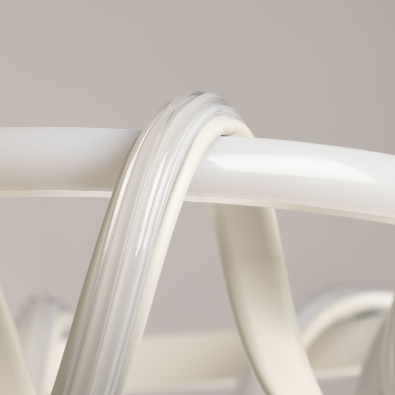 Металлическое основание подвесной люстры окрашено в белый цвет. Корпус плафона выполнен из сплава алюминия и окрашен в белый цвет. Светодиодные источники света закрыты белым силиконом.