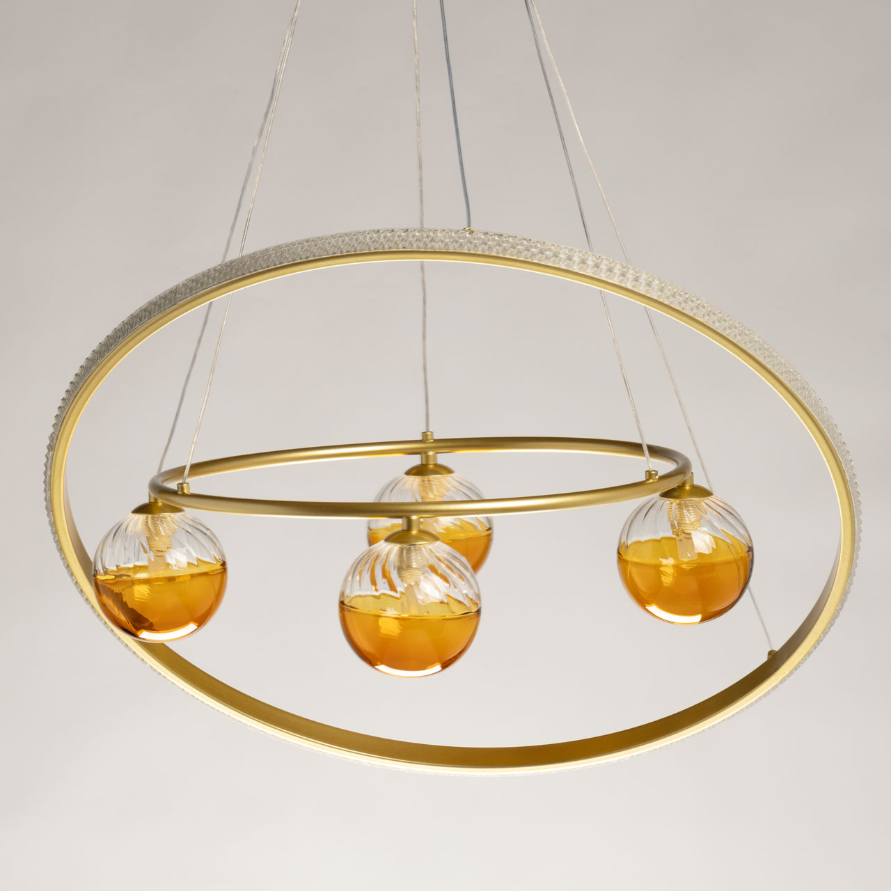 Металлическое основание подвесной люстры гальванизировано в цвет золота. Корпус плафона выполнен из сплава алюминия и окрашен в цвет перламутрового золота. Светодиодный источник света закрыт прозрачным акрилом. Декоративные плафоны с традиционными источниками света G9 выдуваются вручную в форму и окрашены наполовину в цвет янтаря.