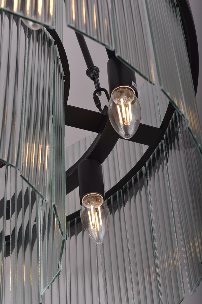Люстра Delight Collection MD2313-8A matt black с плафоном из тонких стеклянных пластин, расположенных в два ряда. Пластины ребристые с одной стороны и гладкие с другой. Металлические части черного цвета.