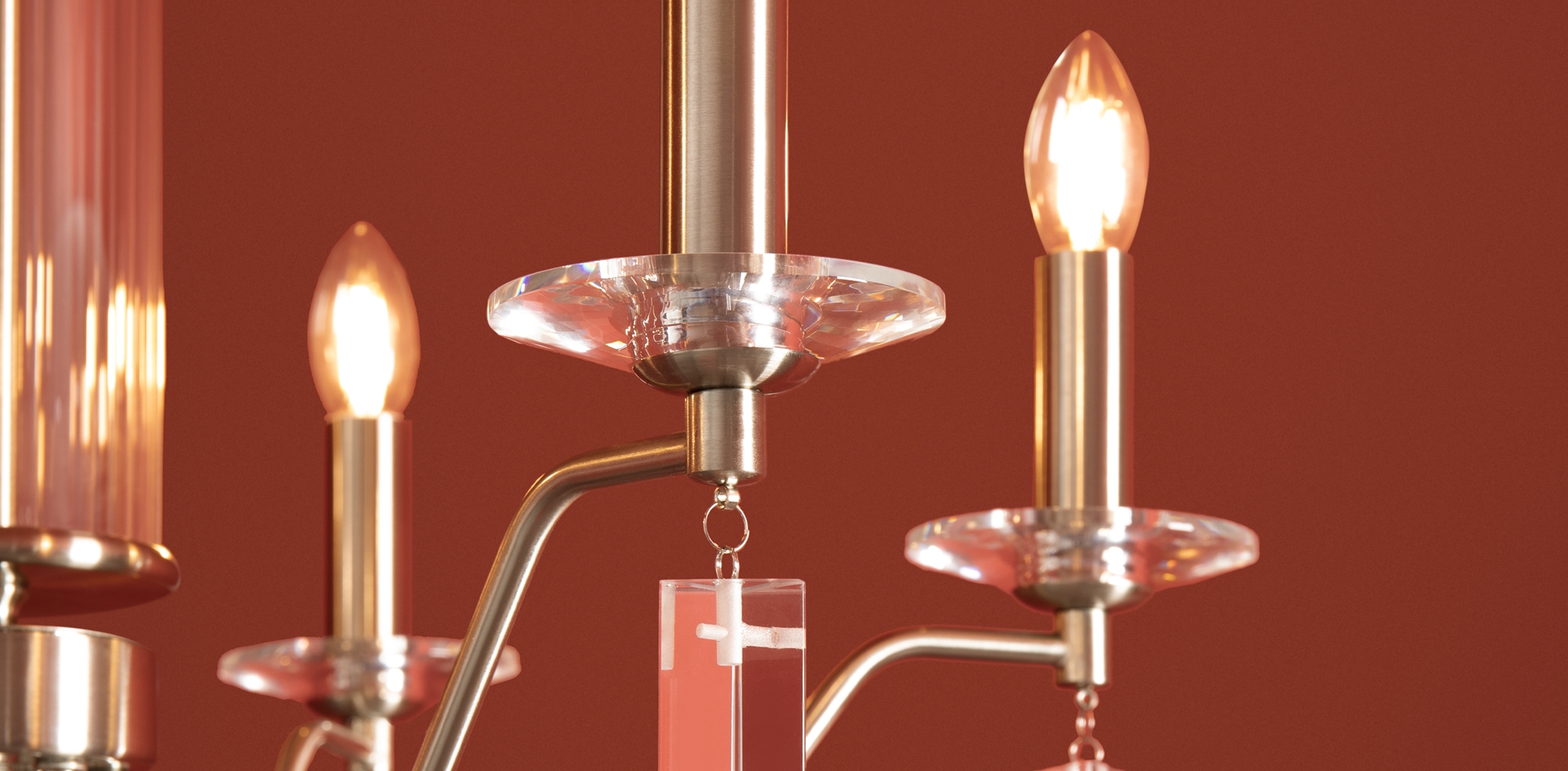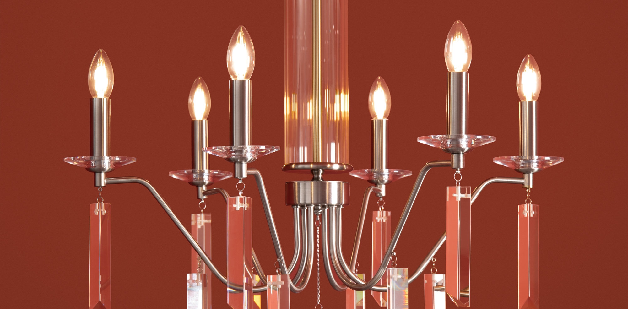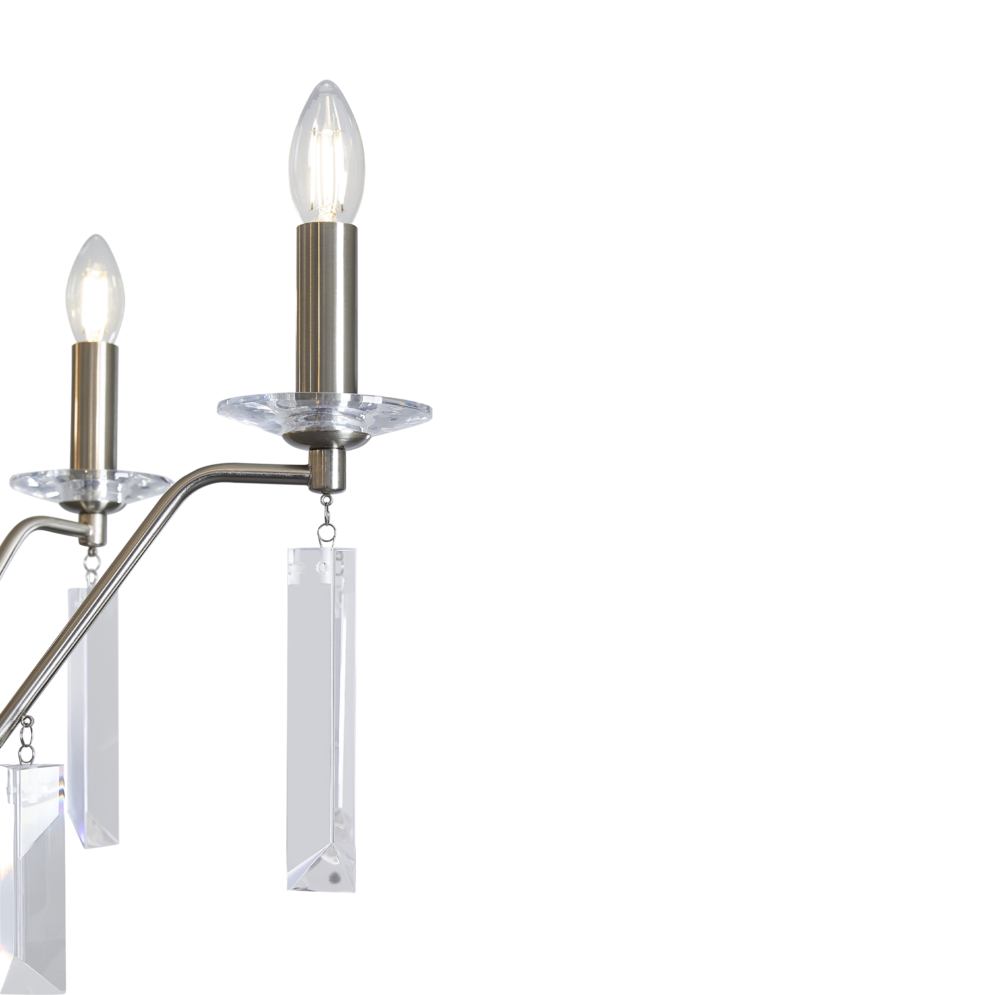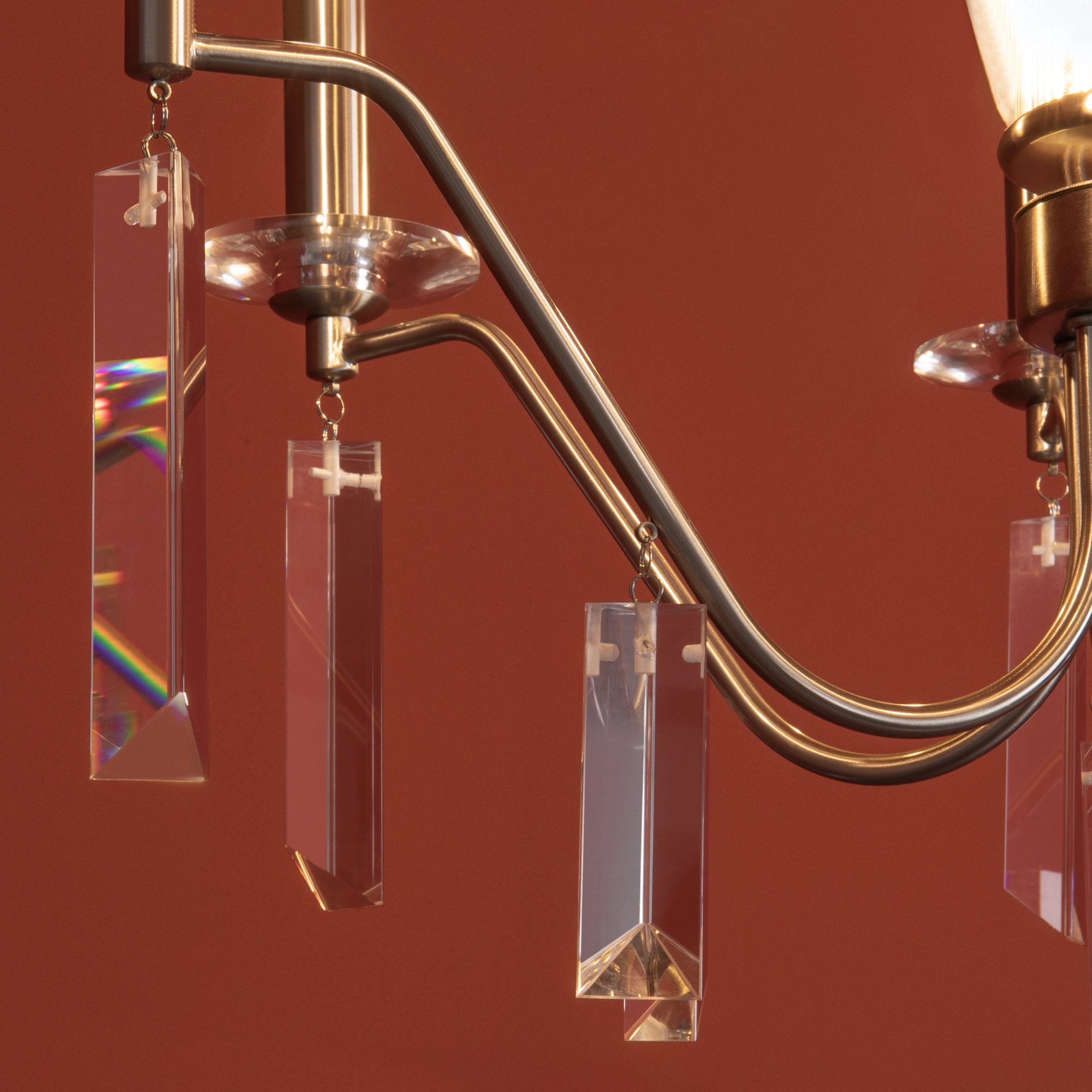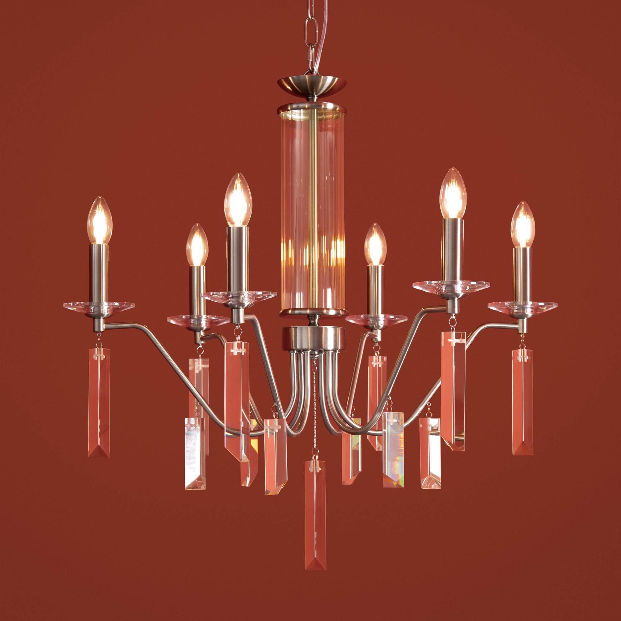 Материал арматуры — металл, цвет — никель или латунь. Подвесные светильники с цоколем E14. Доступны с пятью или шестью источниками света. Грани хрустальных подвесов создают эффект перелива радуги. Центральный декор из стеклянных трубок. Подходит для классических интерьеров.
