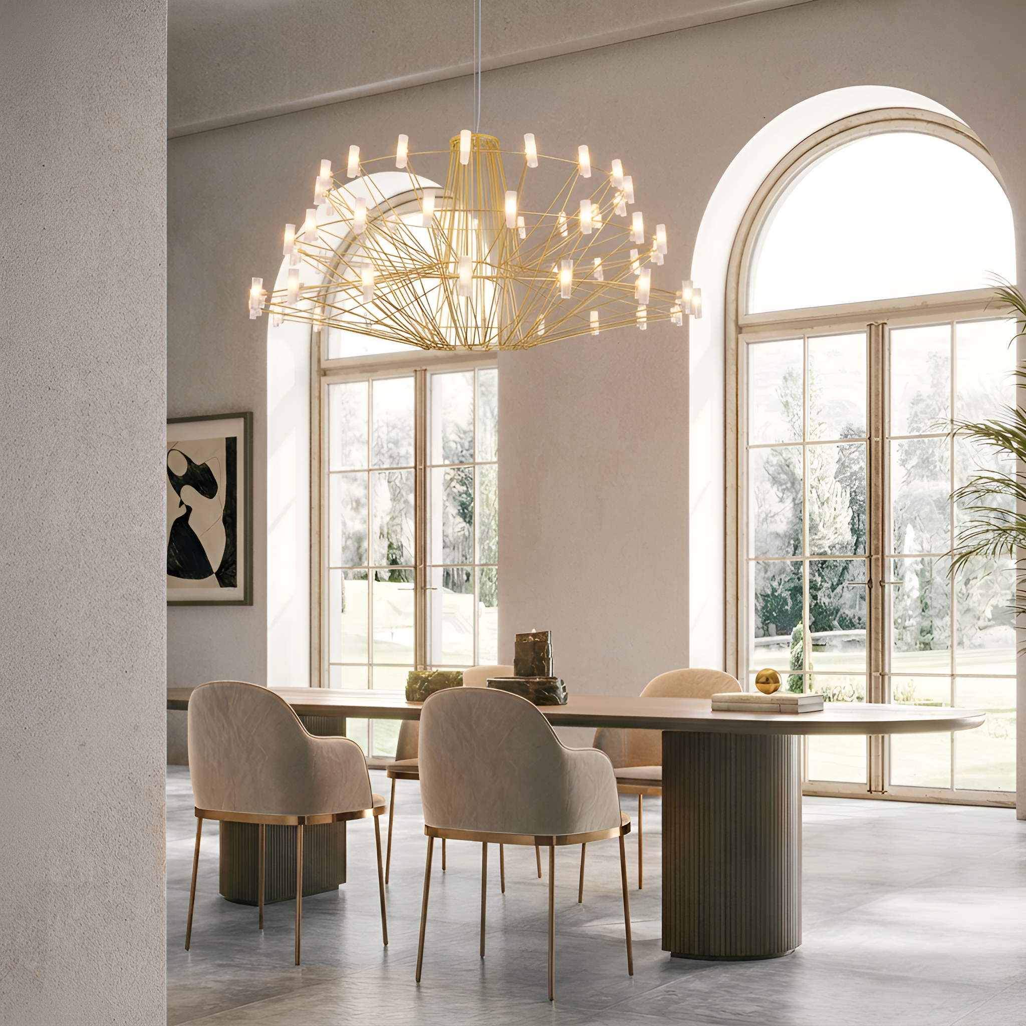Белые цилиндрические плафоны расположены на концах спиц, создавая живой ритм и ощущение динамики, словно свет в любой момент может расплескаться по комнате. Благодаря такому расположению свет мягко раскрывается по всему периметру, подчеркивая архитектуру помещения и создавая уютную атмосферу без резких акцентов.