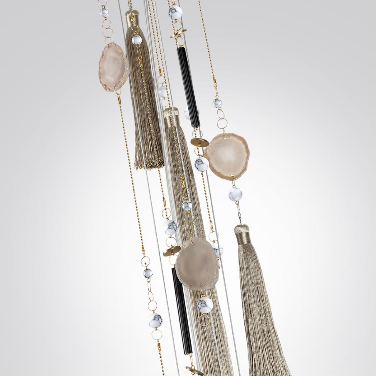 Линия FIOLENT ― нежная серия в неоклассическом стиле, где главный декоративный элемент ― это струящиеся шелковистые кисти и натуральный агат в обрамлении бусин и других элементов из камня говлит, стекла и металла. Стеклянные плафоны украшены паттерном, напоминающим мраморные узоры. Люстра и подвесной светильник могут регулироваться по высоте.