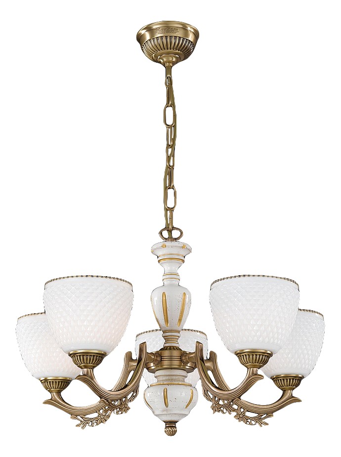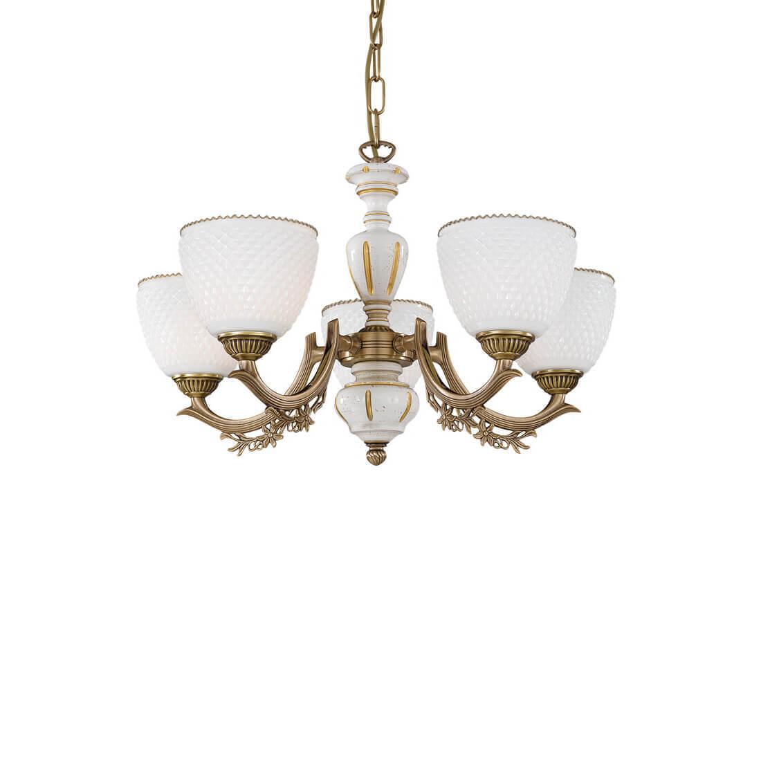 Подвесная люстра Reccagni Angelo L 8656/5 Итальянского производсва – отличный выбор для Вас. Этот светильник Классического стиля хорошо подойдет Для гостиной и придаст помещению мягкий и приятный свет. Плафоны белые из стекла. Арматура бронза из металла. Кол-во ламп - 5шт. Общая мощность 300W