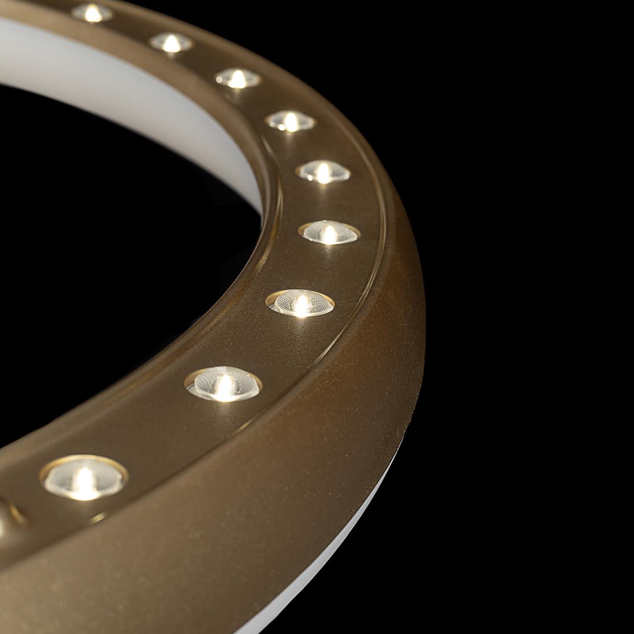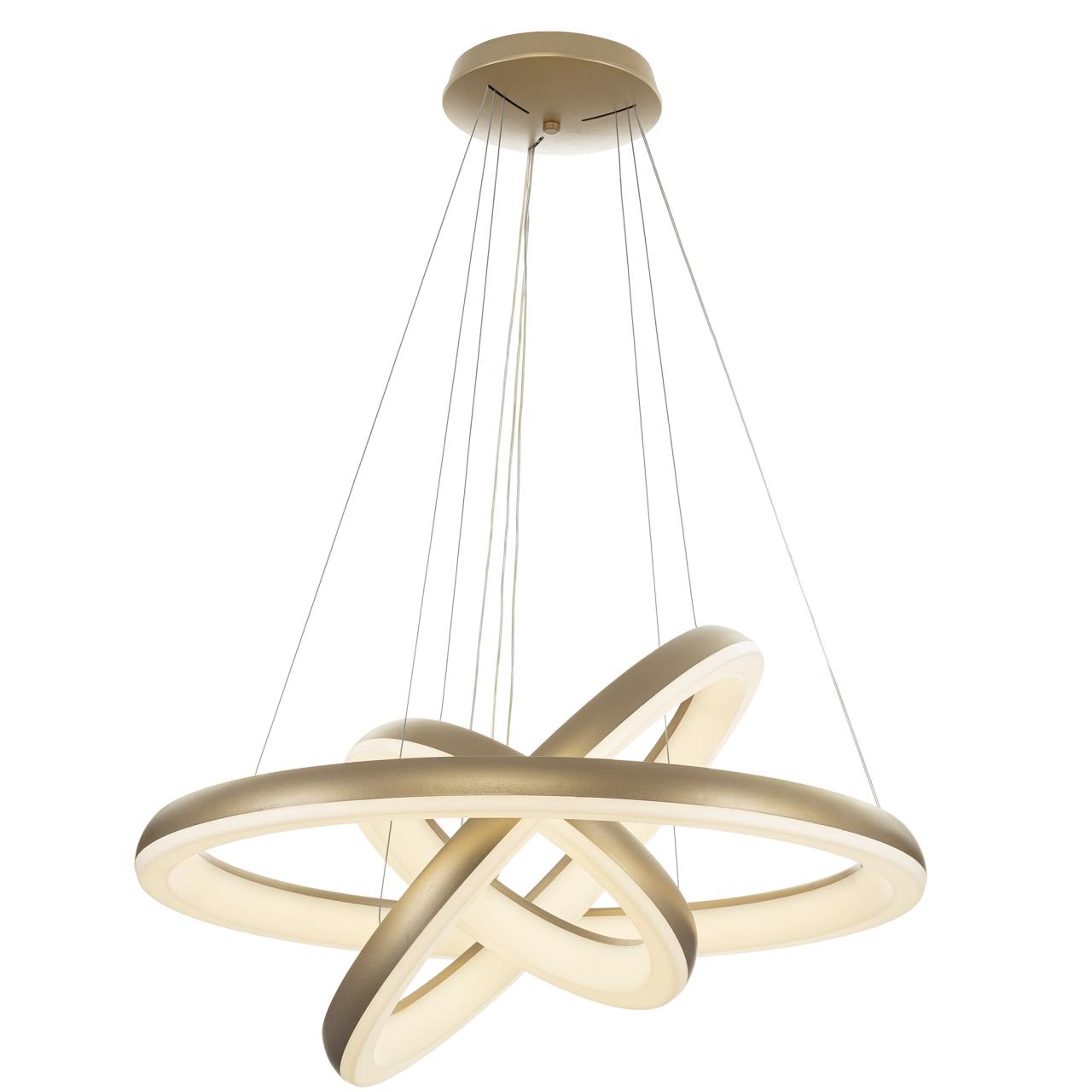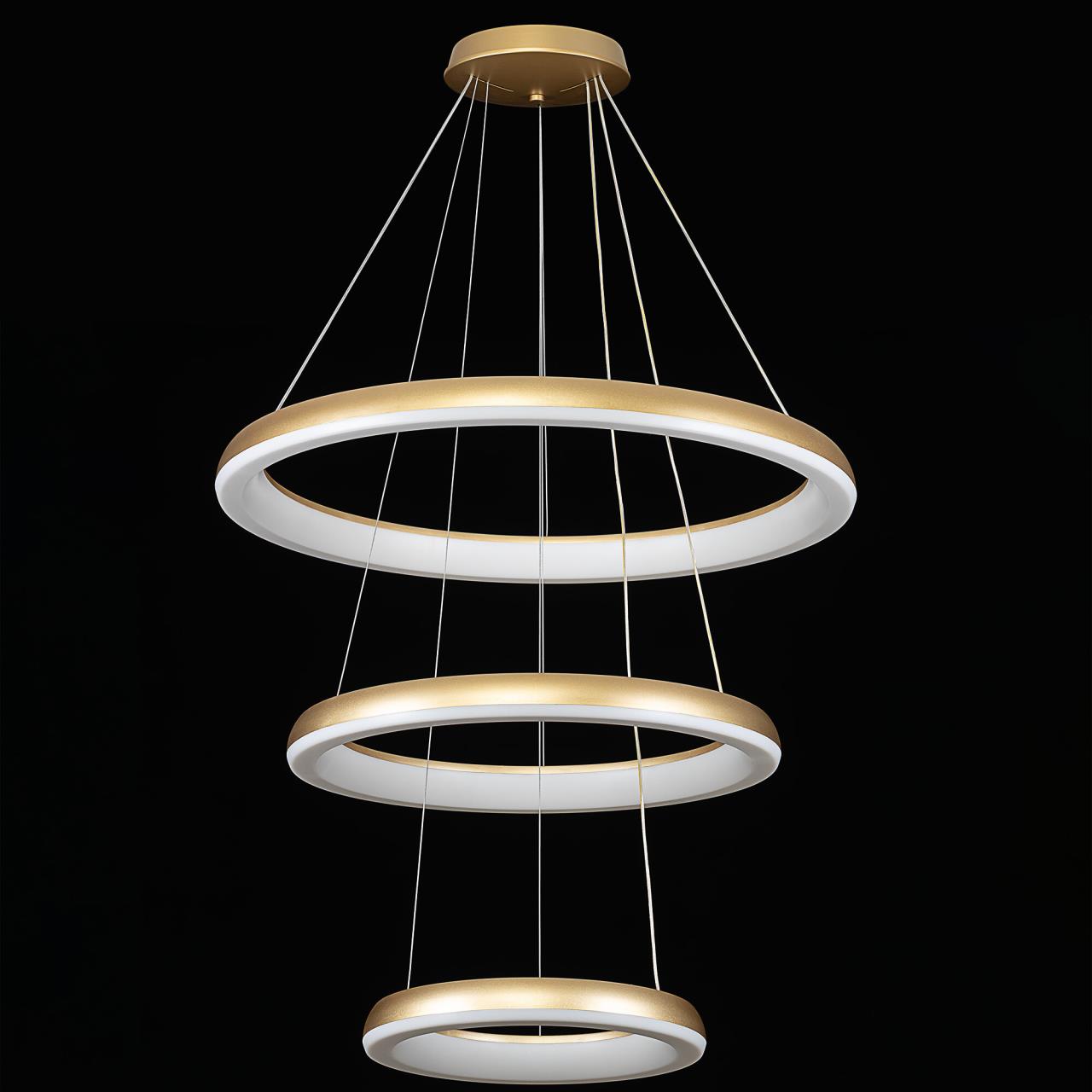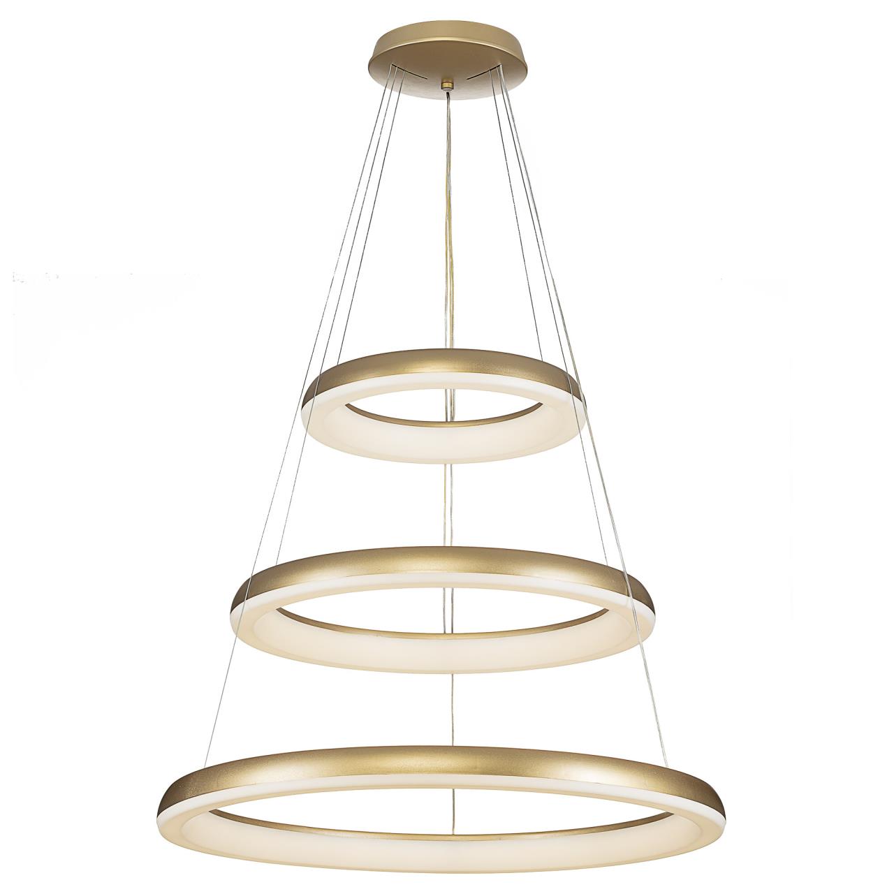 Люстра на тросах в форме каскада из трех подвесных колец, высоту и угол наклона каждого из которых можно изменить. Корпус изготовлен из прочного полимера золотистого оттенка, рассеиватель — оптический полимер. Крепление люстры подходит для всех типов потолков, в том числе натяжных. Тип крепления — планка. Суммарная мощность светильника 170Вт, световой поток 12500Лм.