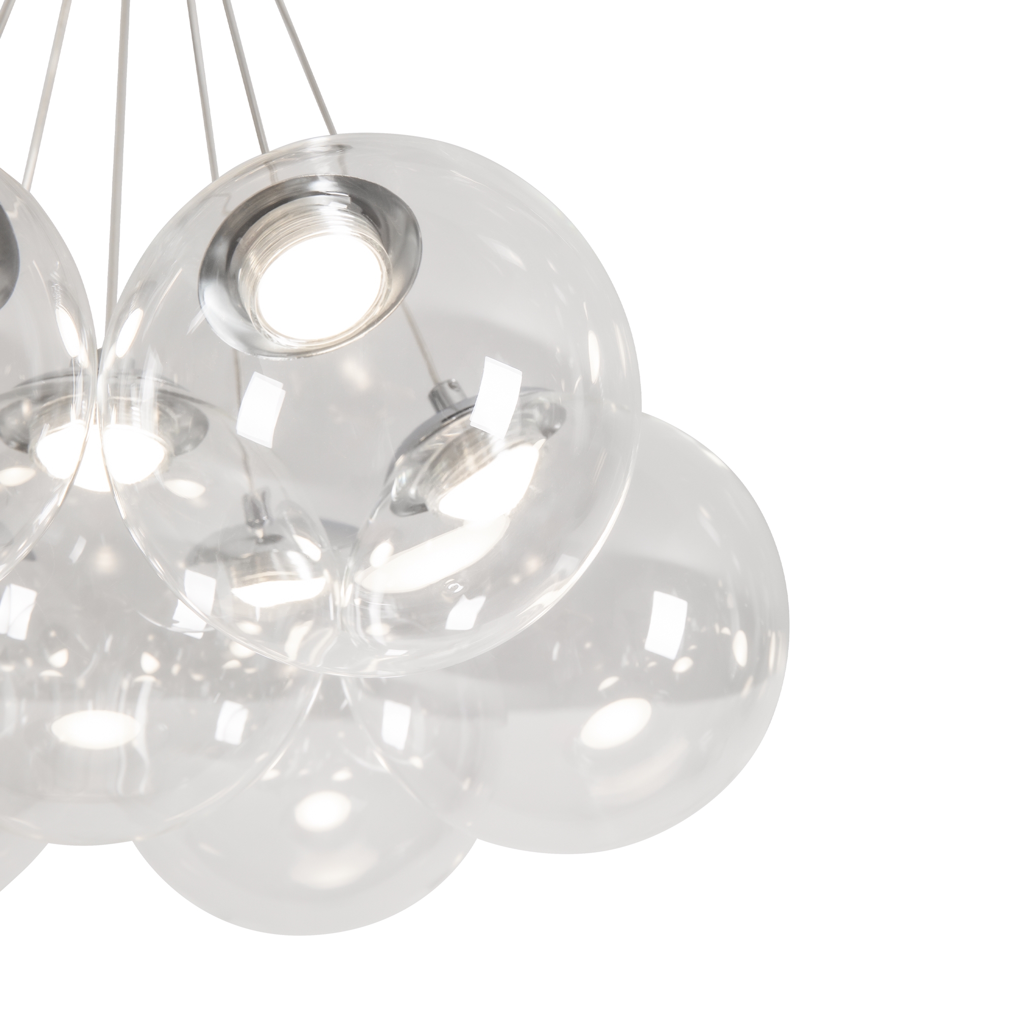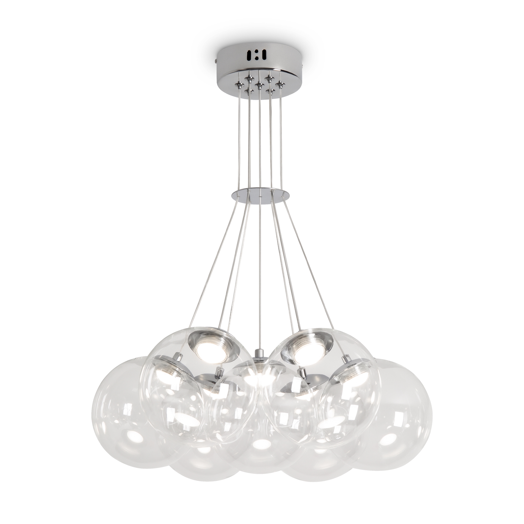 Арматура - металл (никель). Абажуры из дутого стекла с LED (2800K). Прозрачные плафоны подчеркивают современный дизайн. Высота 500-2500 мм. Серия станет ярким акцентом в вашем интерьере.