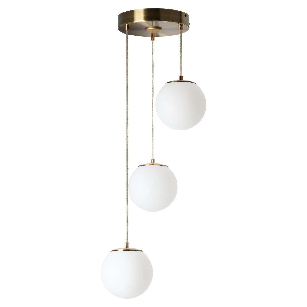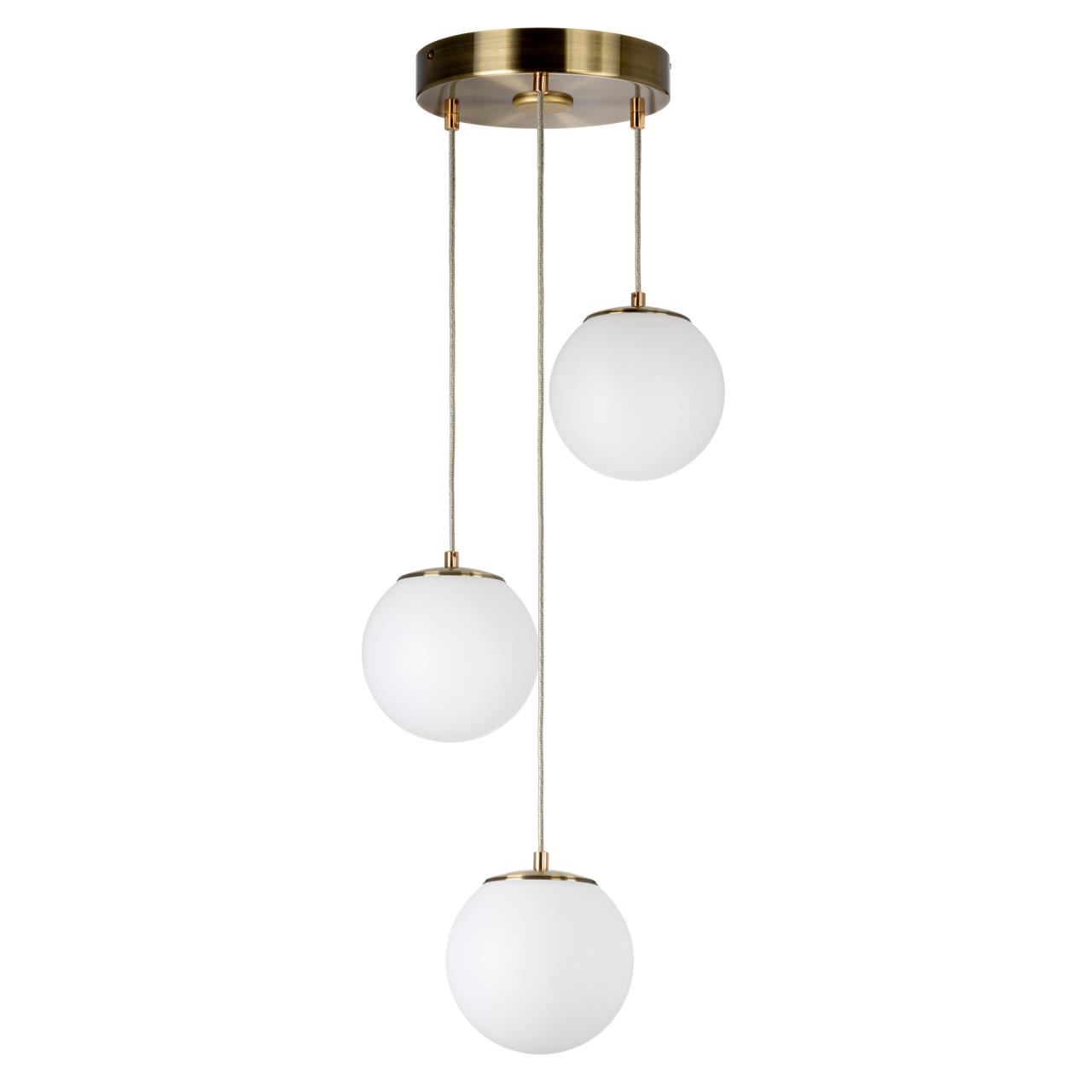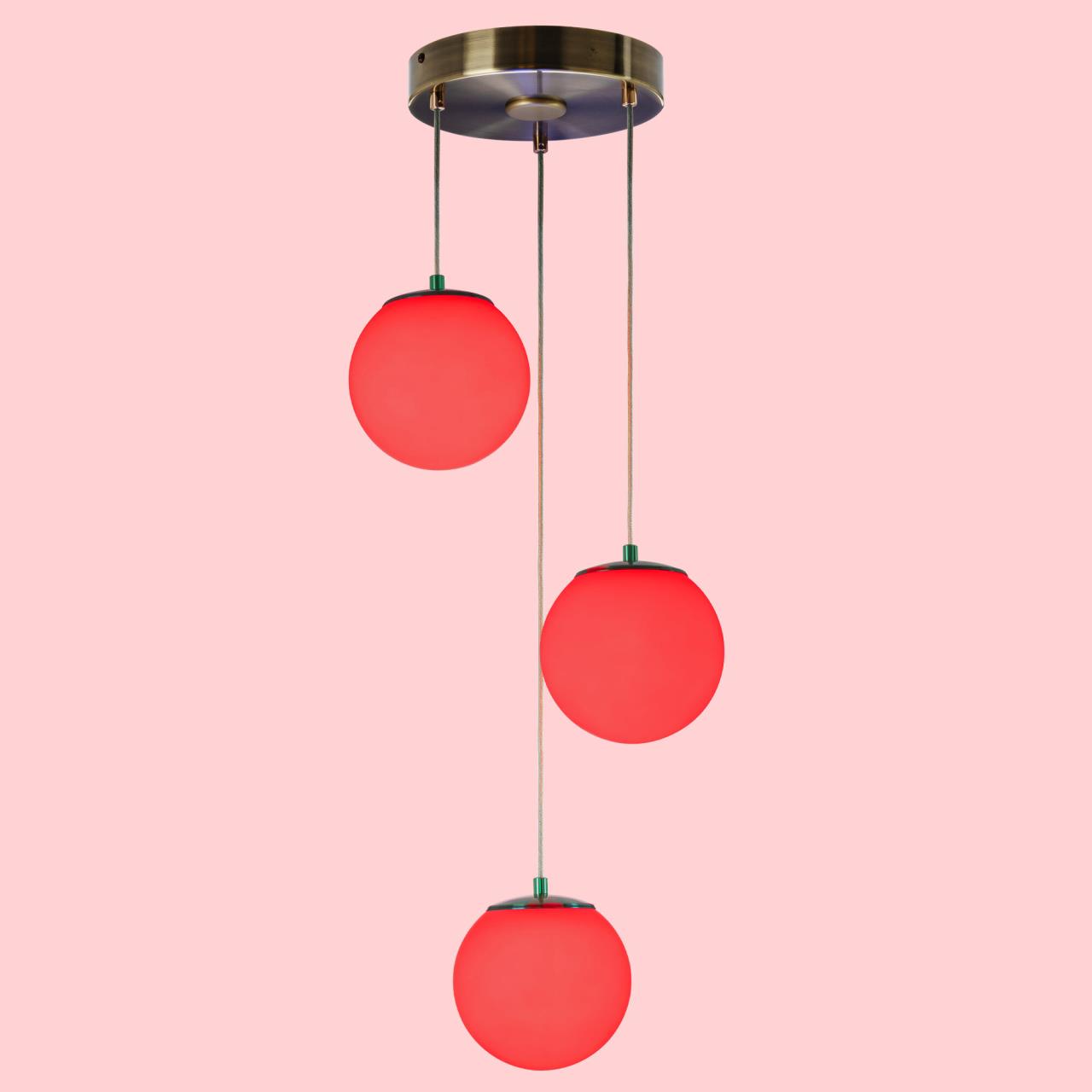 Основание светильника металлическое, круглой формы, цвет - благородная бронза. Три плафона в форме шара, изготовлены из матового оптического полимера, подвешены ниспадающим каскадом. Внутри каждого плафона расположена уникальная светодиодная панель, обеспечивающая яркое основное освещение или красочную RGB подсветку, с плавной регулировкой яркости во всех режимах света.