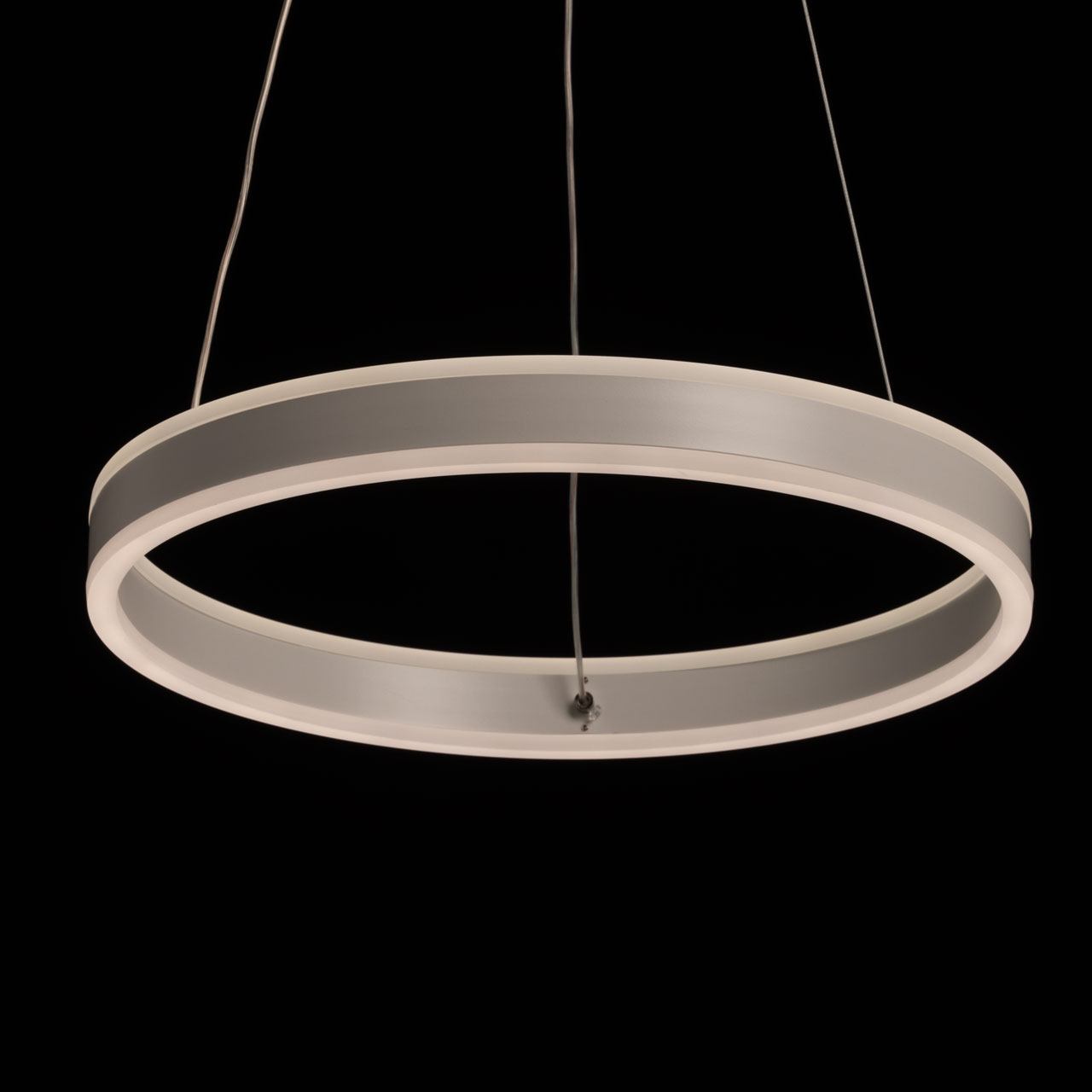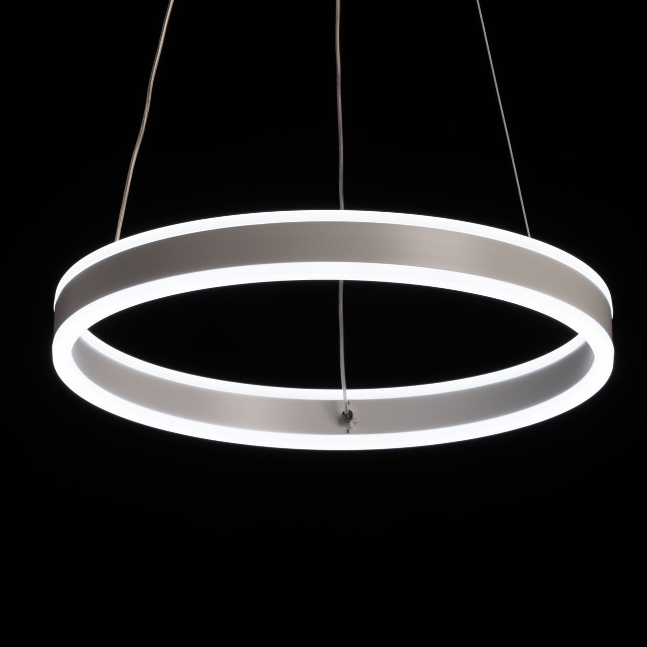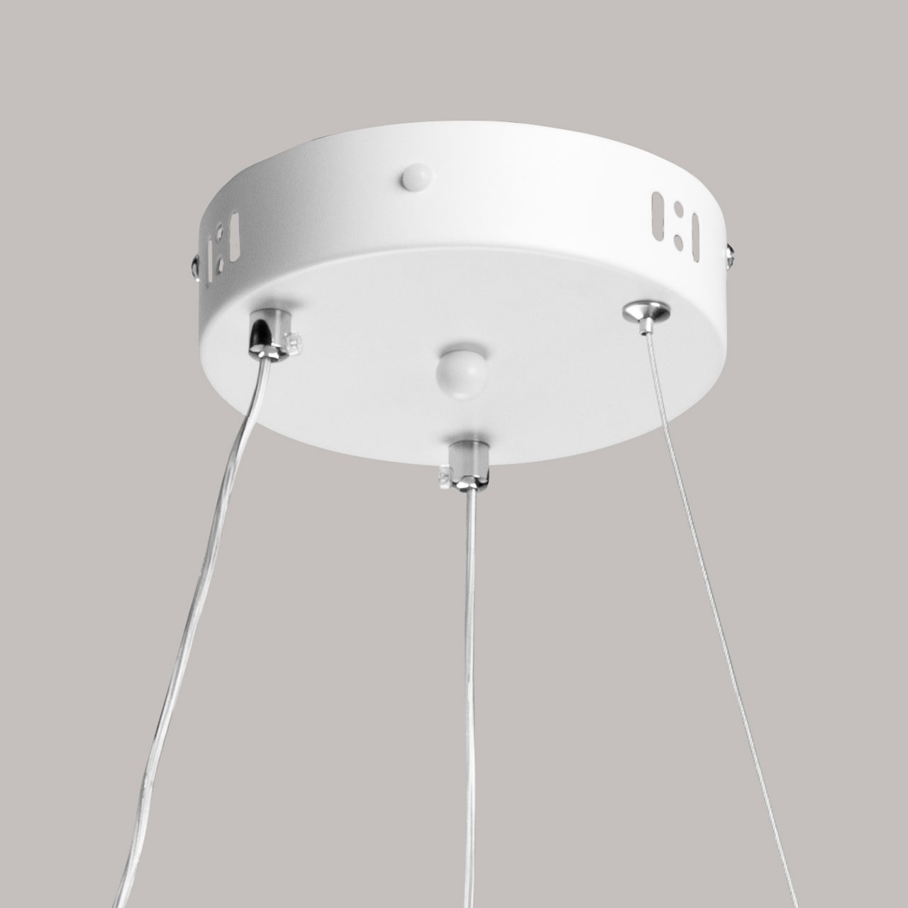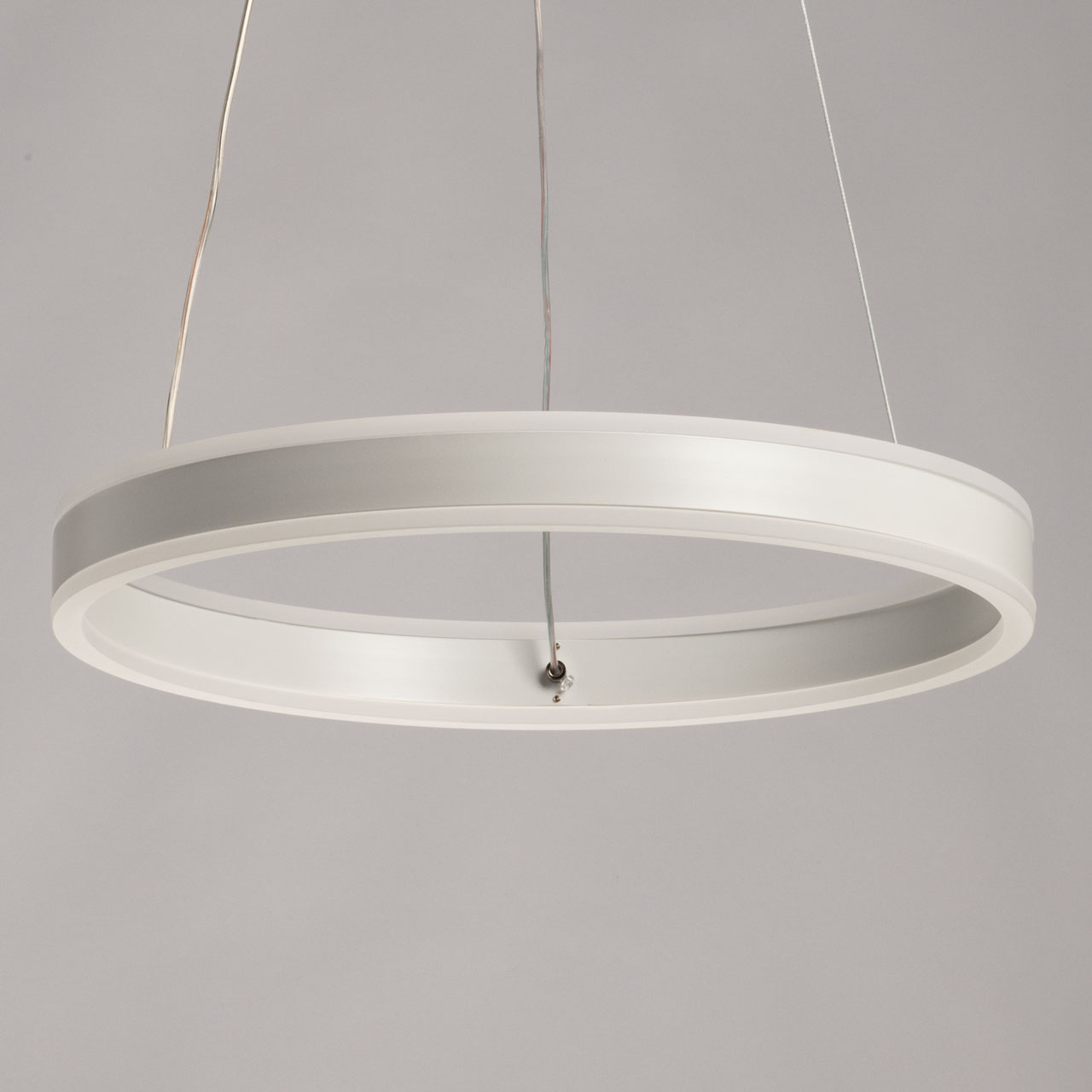 Металлическое основание подвесной люстры окрашено в белый цвет. Плафон люстры выполнен из сплава алюминия с цинком и окрашен в цвет основания. Светодиодные источники света закрыты белым матовым акрилом.