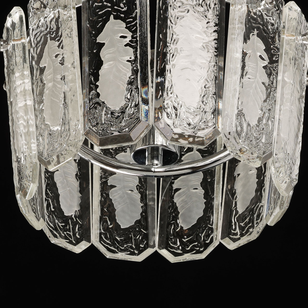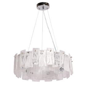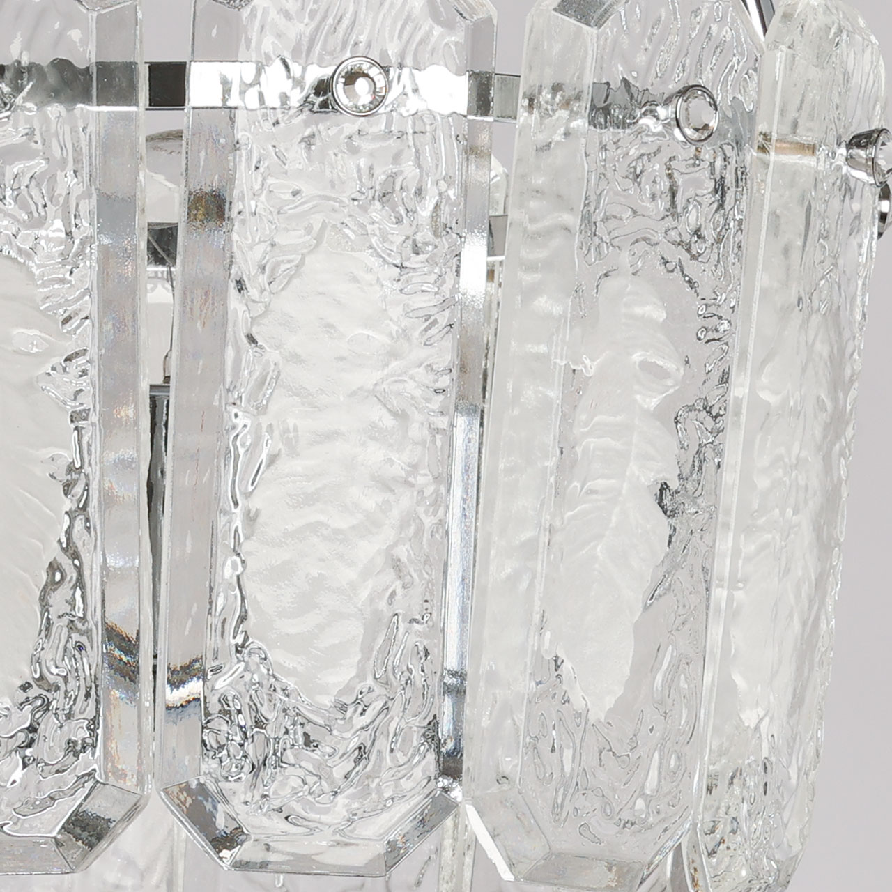 Металлическое основание люстры гальванизировано в цвет хрома. Плафон выполнен из прозрачного фактурного хрустального стекла овальной формы.