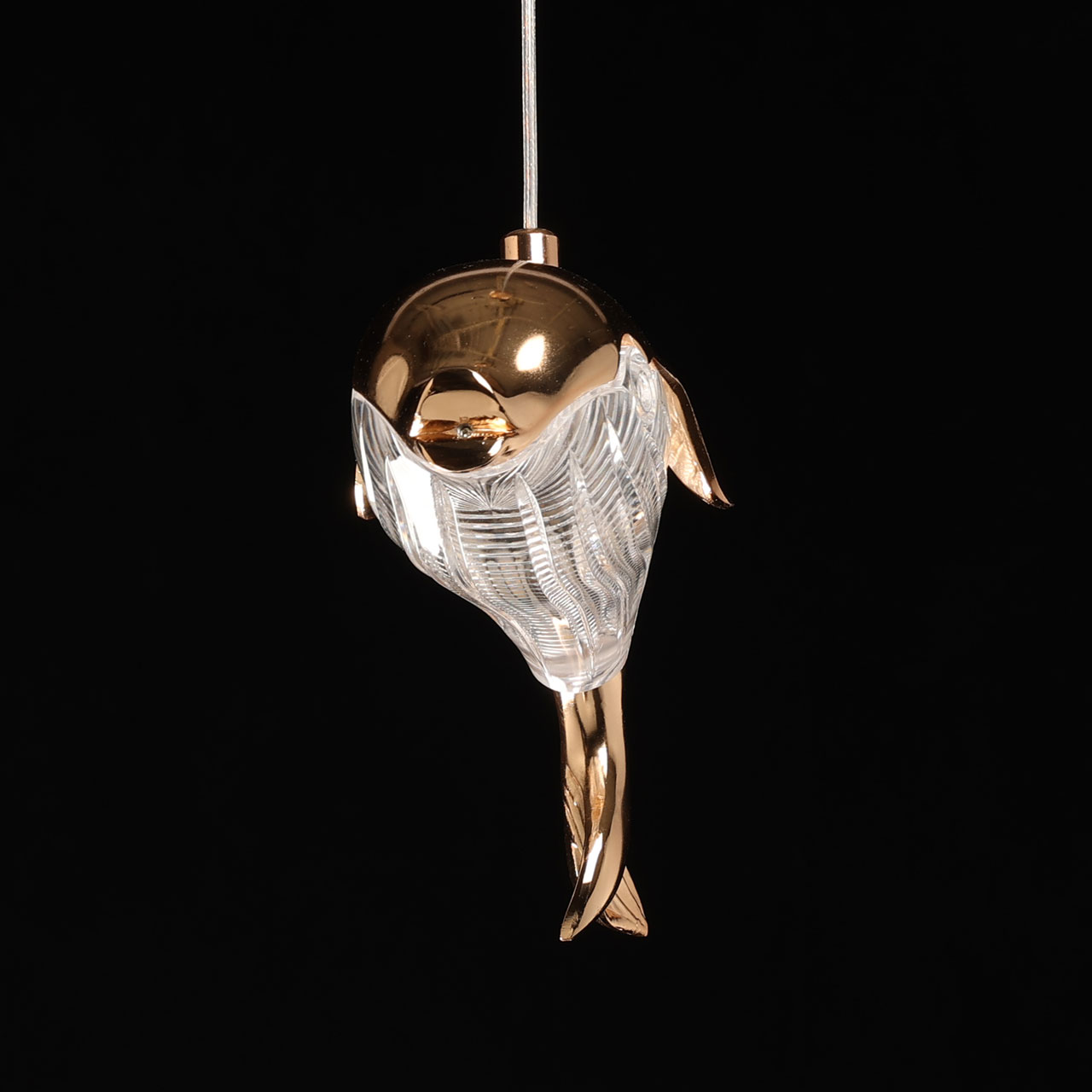 Металлическая потолочная чаша подвеса гальванизирована в цвет французского золота. Корпус плафона в виде дельфина выполнен из сплава алюминия с цинком по технологии художественного литья и гальванизирован в цвет основания. Светодиодный источник света закрыт прозрачным фактурным акрилом.