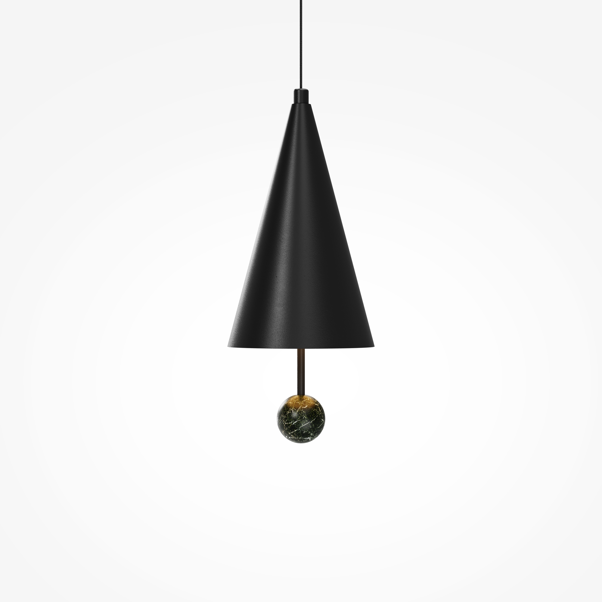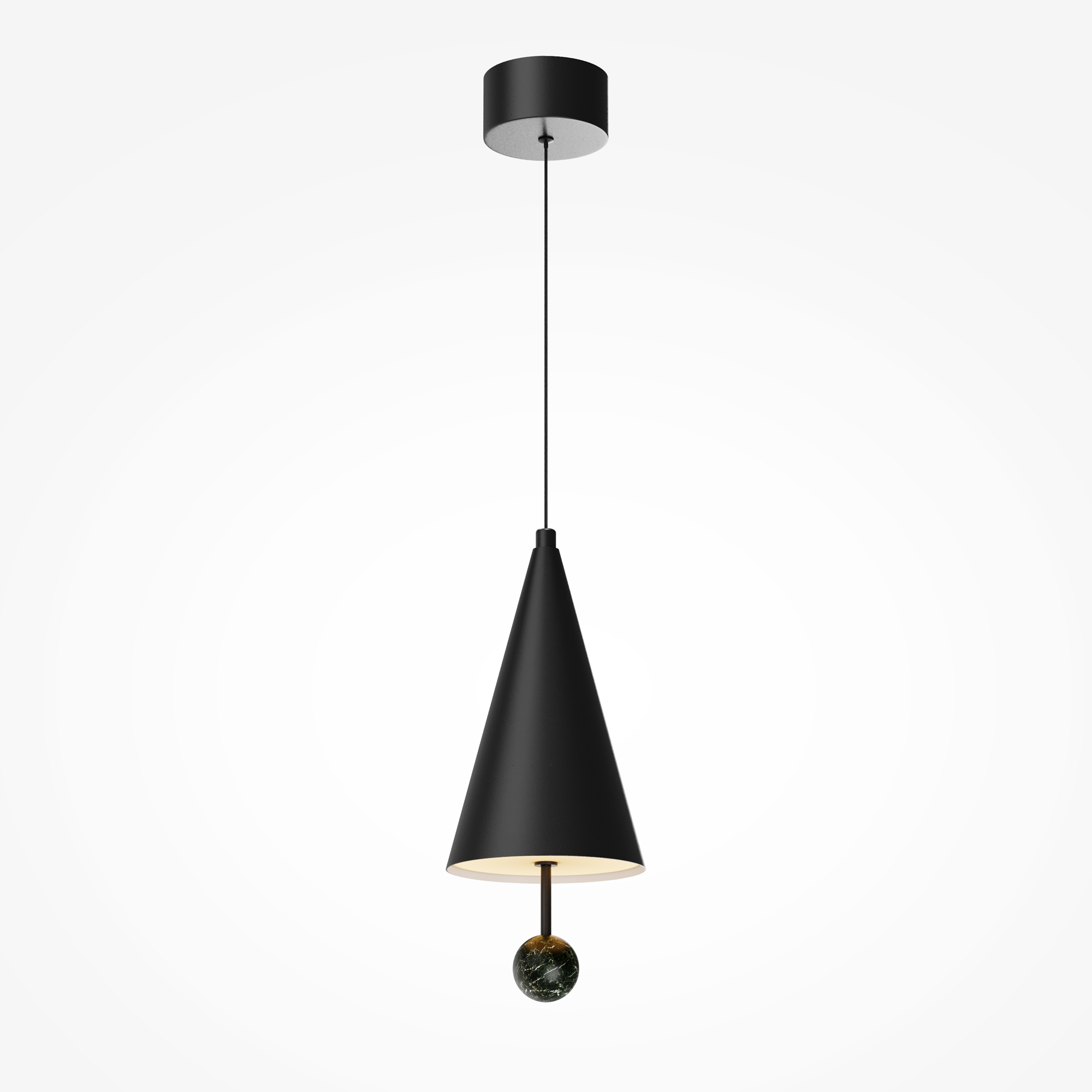 Главный акцент серии — натуральный зелёный мрамор с его неповторимым природным рисунком. Чёрная металлическая арматура создаёт гармоничный контраст. LED-источник с температурой 3000К, скрытый за акриловым рассеивателем, создаёт атмосферную подсветку для деликатного зонирования. В серии представлены подвесы двух форм — конус и вытянутый цилиндр, которые можно использовать как сольные акценты или комбинировать в многоуровневые композиции, меняя длину провода (3000 мм).