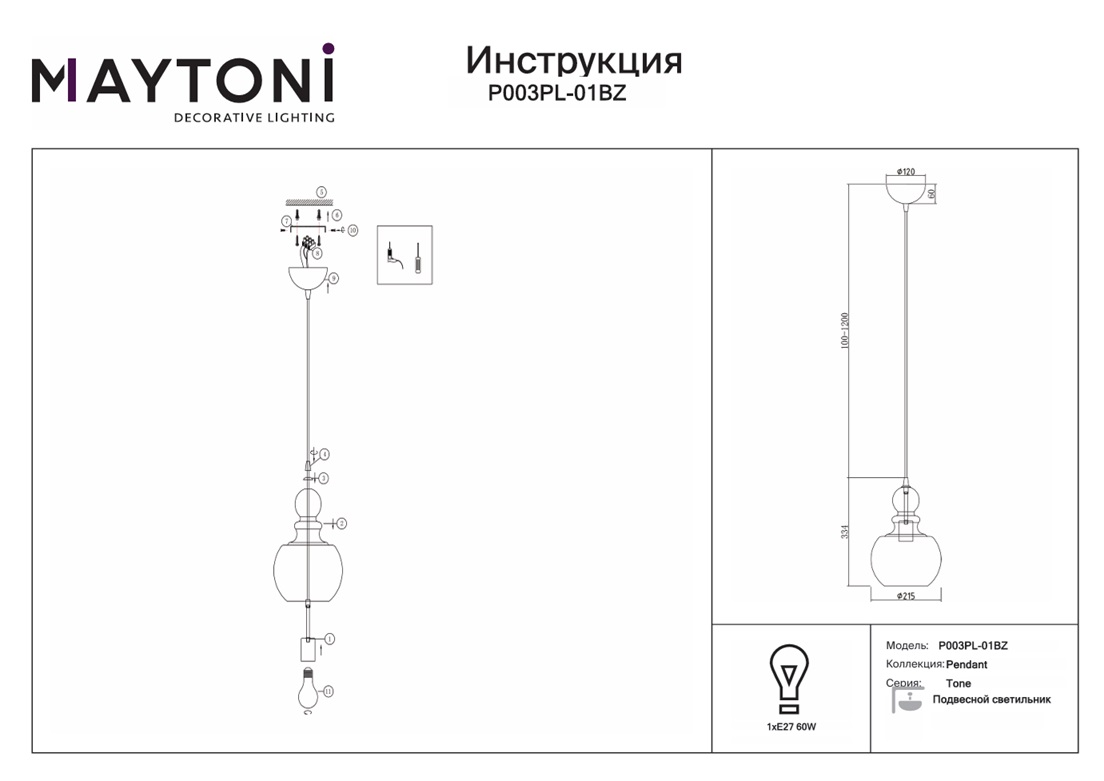Купить "Подвесной светильник Maytoni Tone P003PL-01BZ"