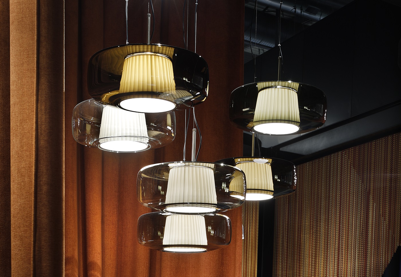 Подвесной светильник Vistosi Plisse SP G Amber с арматурой матового бронзового цвета. Выдувное стекло диффузора янтарного цвета скрывает внутренний тканевый абажур и дает жизнь игре прозрачности, цветов и текстур, которые делают Plissè элегантным элементом, способным охарактеризовать и придать индивидуальность помещению, в котором он находится.