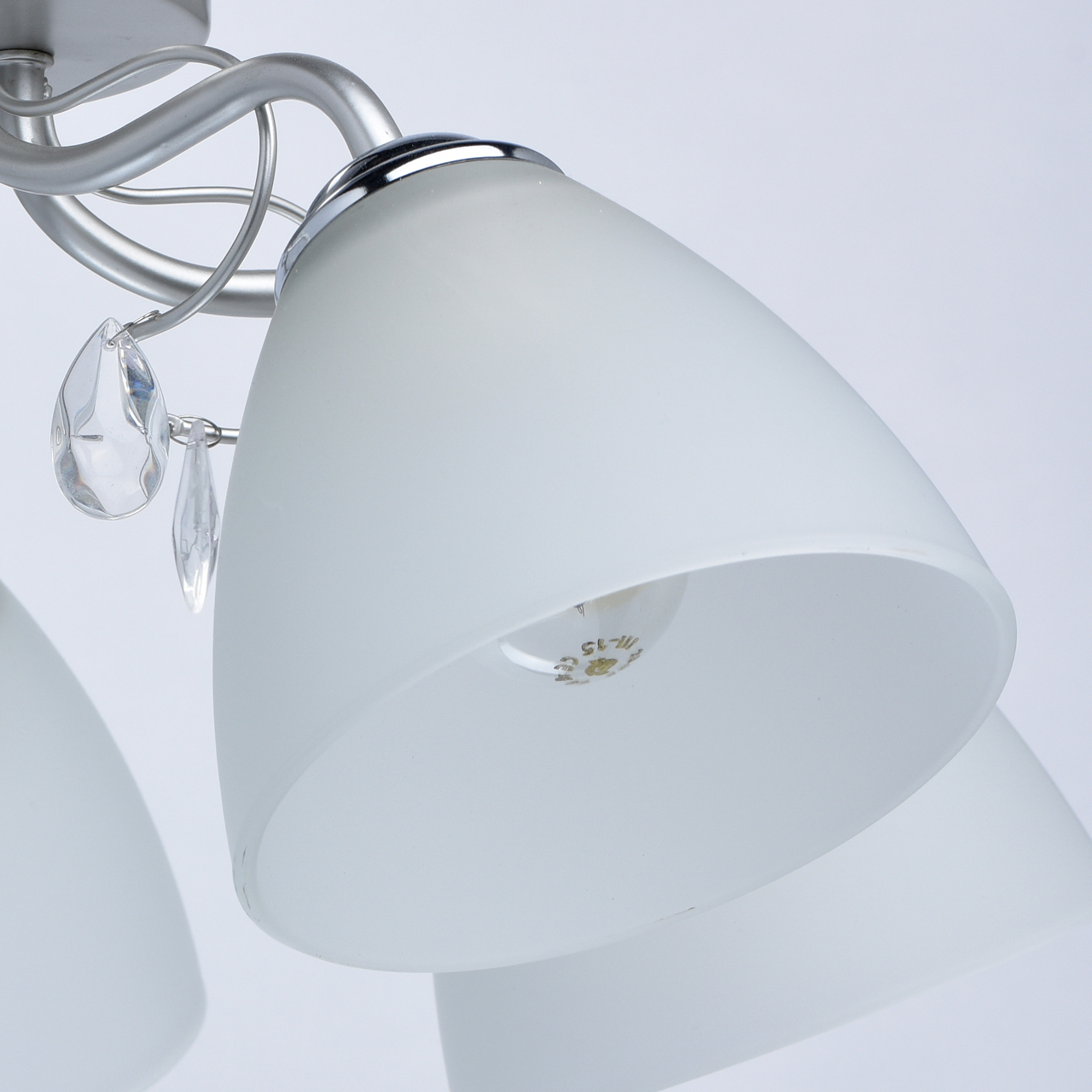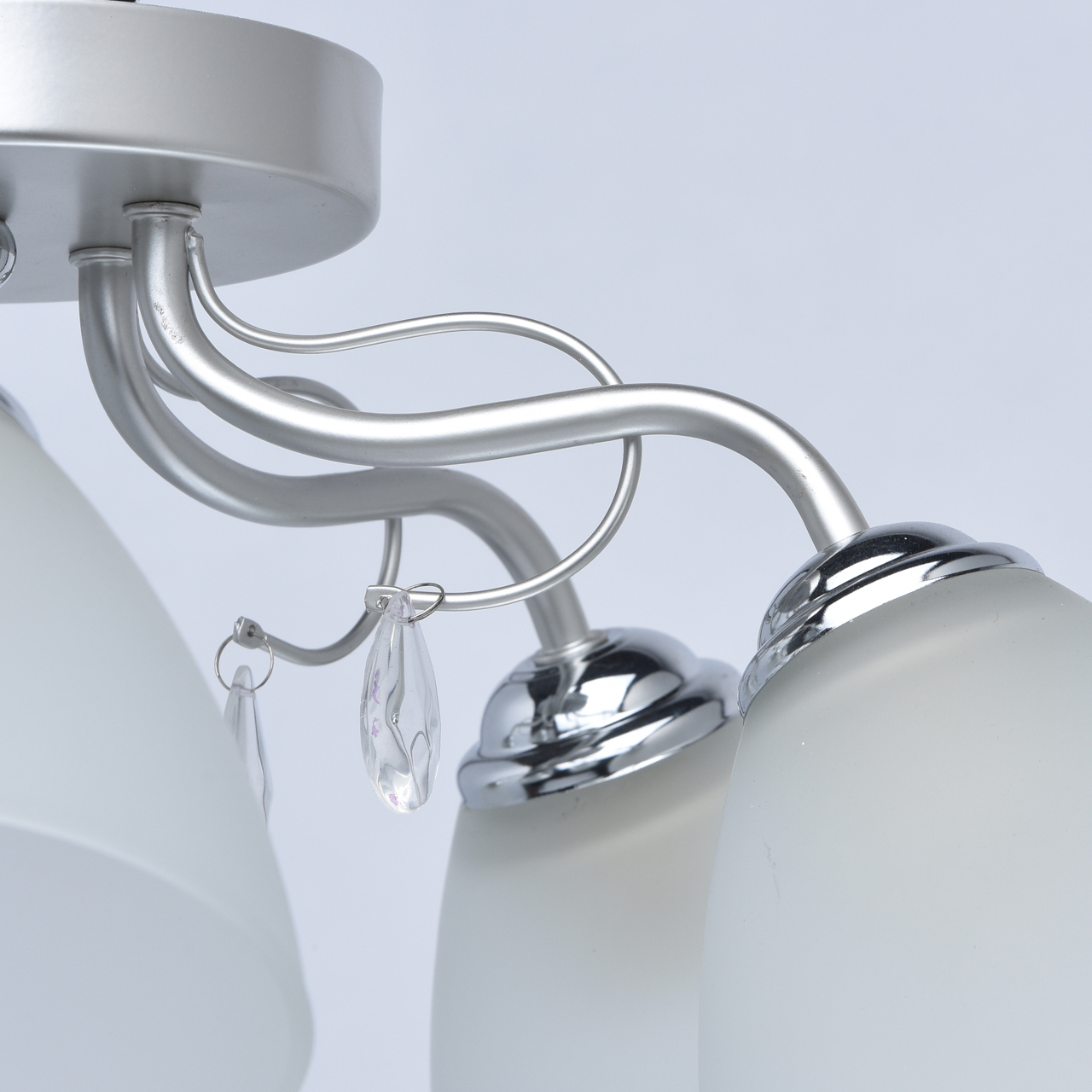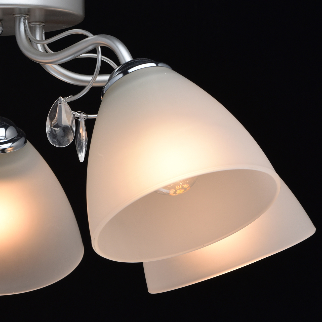 Основание светильника выполнено из металла и окрашено в цвет перламутрового серебра. Держатели плафонов гальванизированы в цвет хрома. Плафоны из матированного стекла. Светильник декорирован подвесками из стекла.