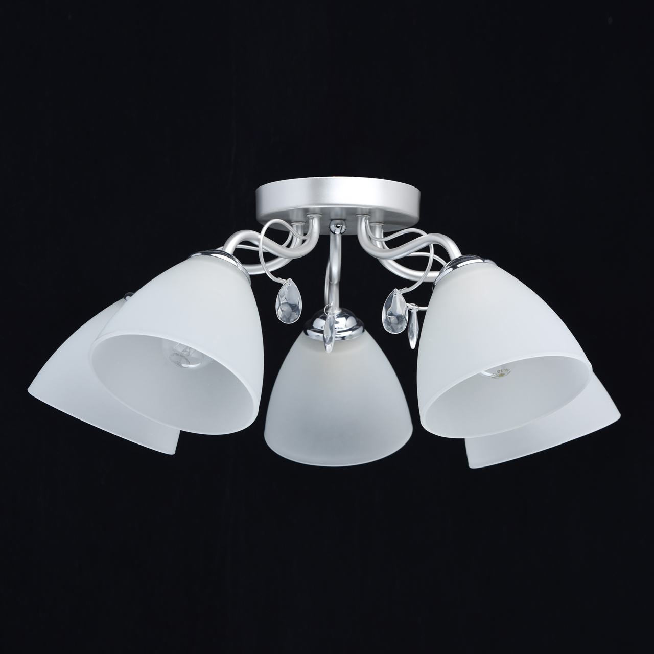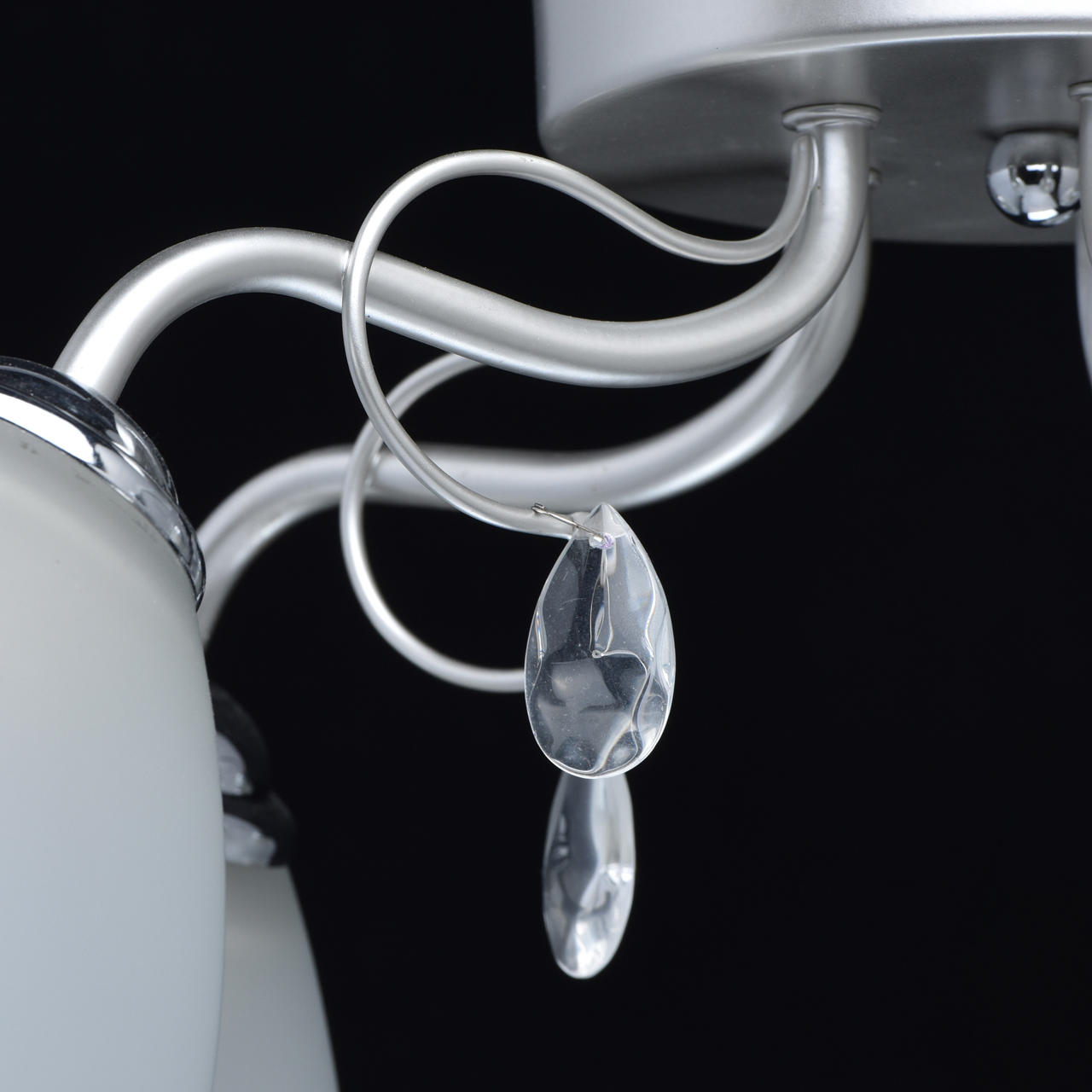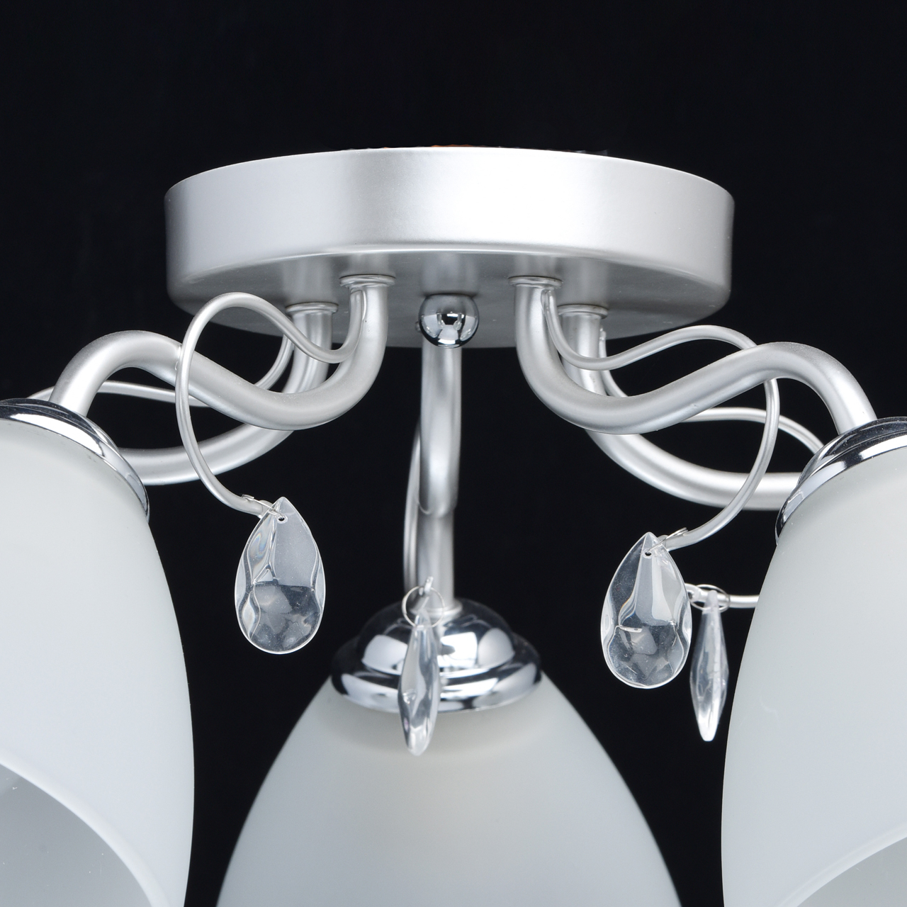 Основание светильника выполнено из металла и окрашено в цвет перламутрового серебра. Держатели плафонов гальванизированы в цвет хрома. Плафоны из матированного стекла. Светильник декорирован подвесками из стекла.