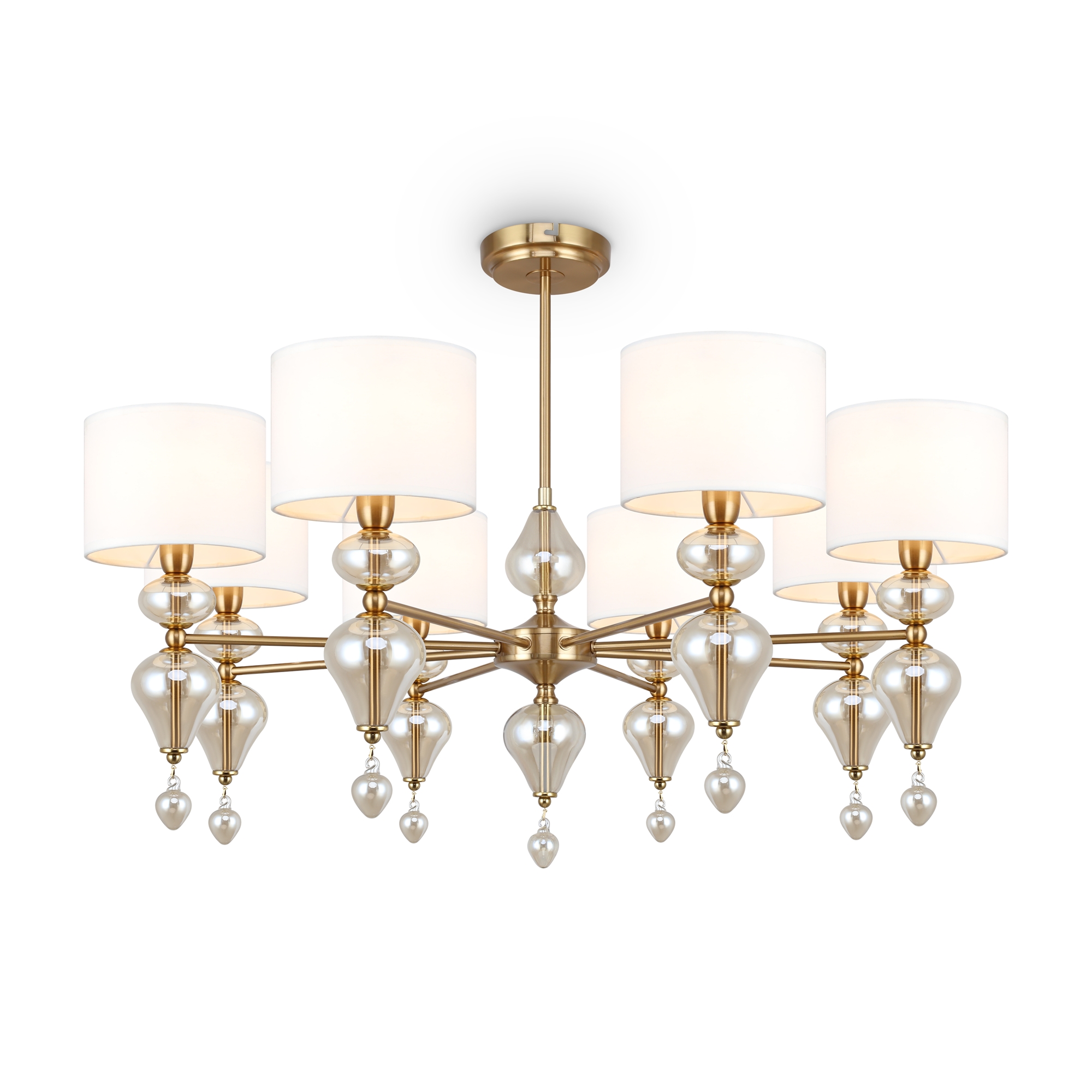 Изумительная модель FR5369CL-08BS от немецкого производителя Freya относится к коллекции Raise ,металлическая конструкция декорирована выдувными стеклянными элементами окрашена в цвет латуни , материал абажуров тканевый -молочного цвета. Источником света служит лампа с цоколем Е14 и площадью освещения 18 кв.м. Данную модель можете купить в интернет-магазине 220svet.ru