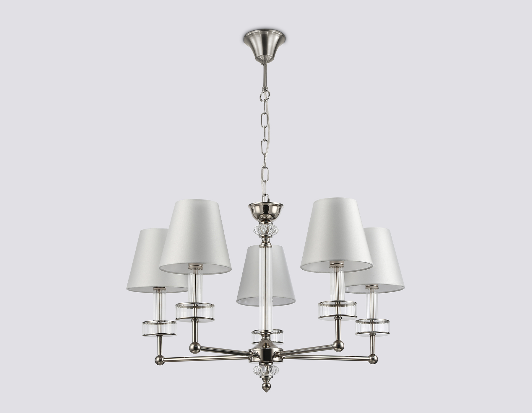 Подвесная люстра с абажурами и хрусталем из коллекции HIGH LIGHT. Модель LH71001 представлена в стиле неоклассика. Люстра выполнена из металла цвета никель, тканевых плафонов белого цвета и декорирована превосходным прозрачным хрусталем. Для данной модели подойдут лампы с цоколем Е14. Люстра будет прекрасным дополнением в любом помещении.
