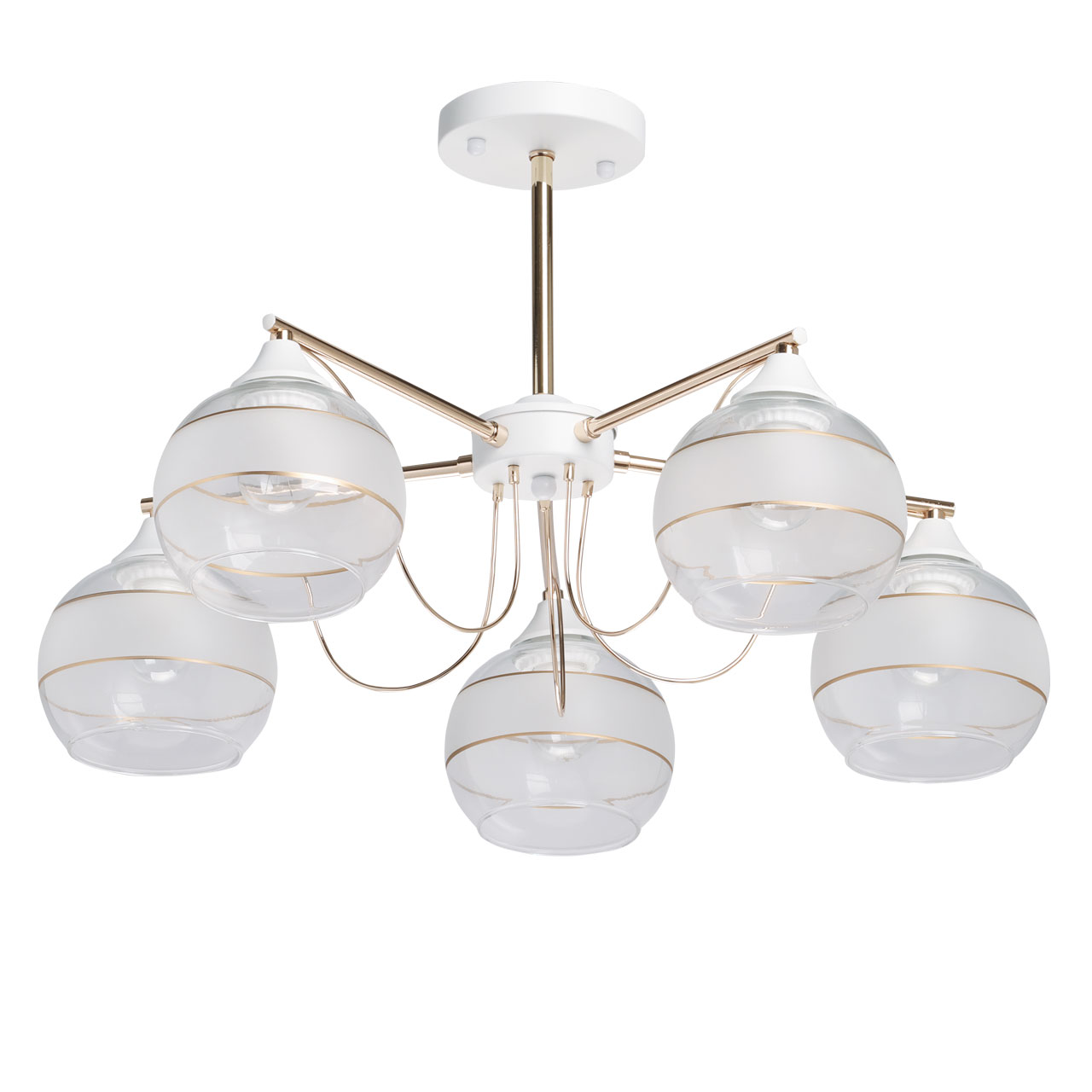 Металлическое основание потолочной люстры окрашено в белый цвет. Отдельные элементы основания гальванизированы в цвет золота. Выдувные вручную стеклянные плафоны матированы по трафарету. Матированная часть плафонов выделена золотым кантом.