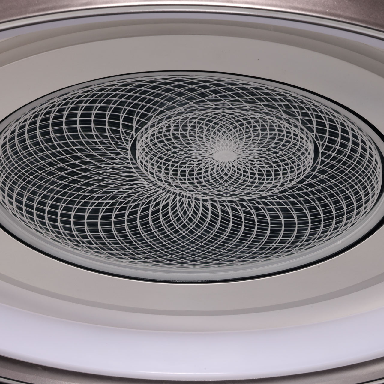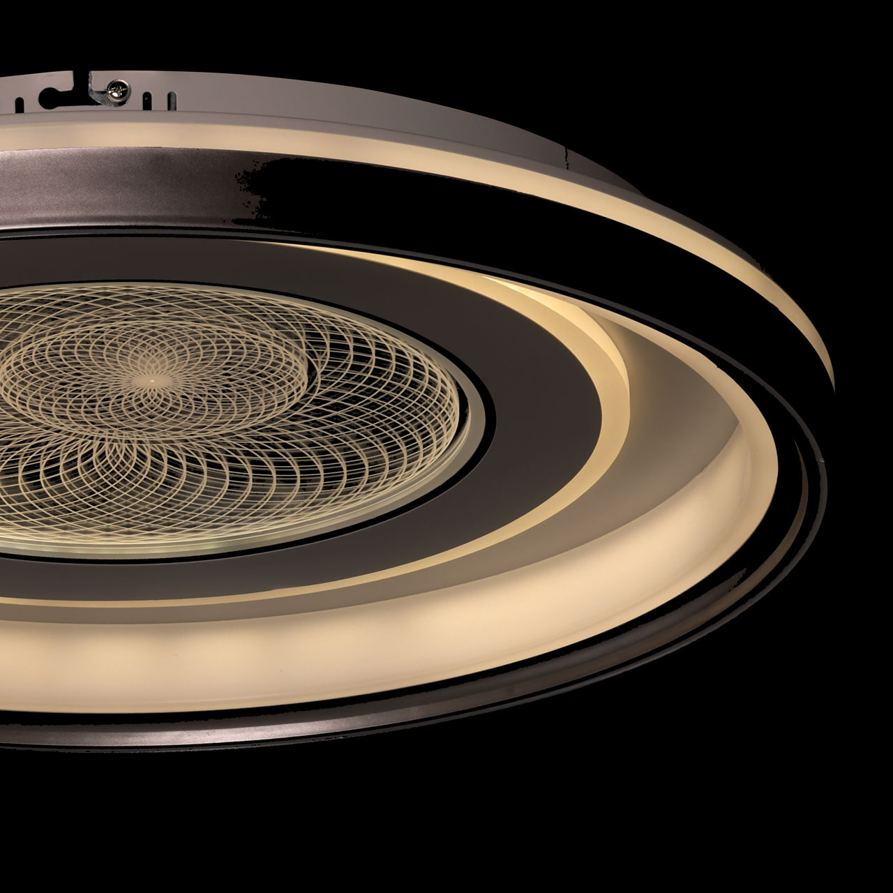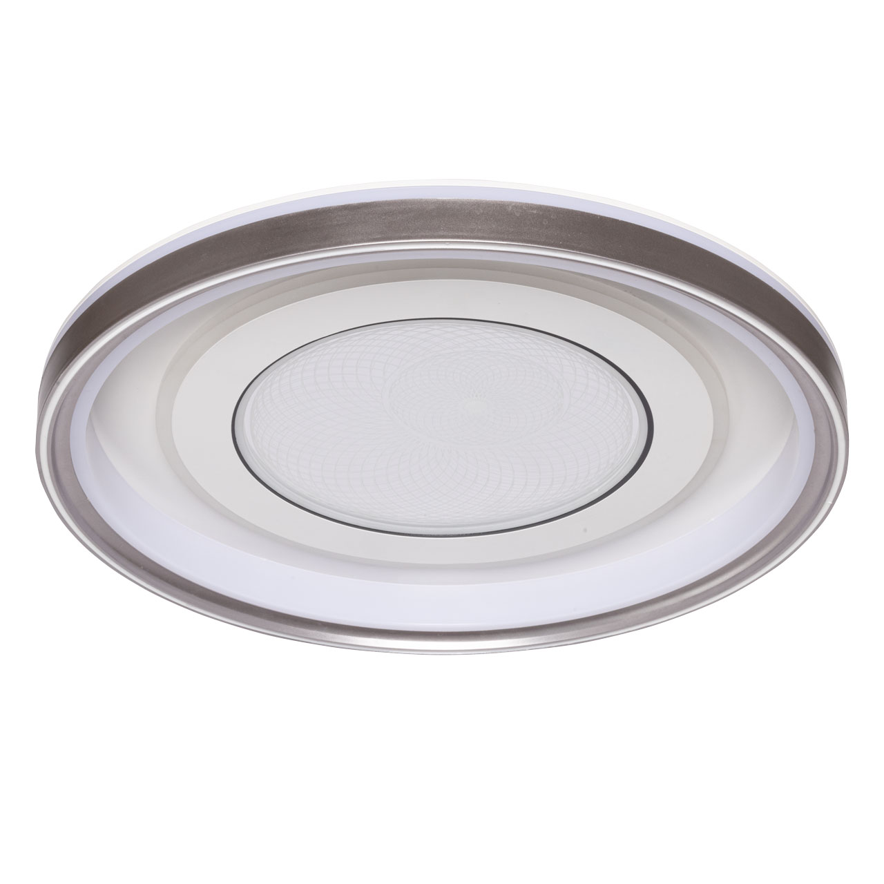 Металлическое основание потолочной люстры окрашено в белый цвет. Корпус плафона выполнен из сплава алюминия с цинком и окрашен в серый и белый цвета. Светодиодные источники света закрыты прозрачным акрилом с 3D-эффектом. Светодиоды по периметру плафона закрыты белым матовым силиконом.