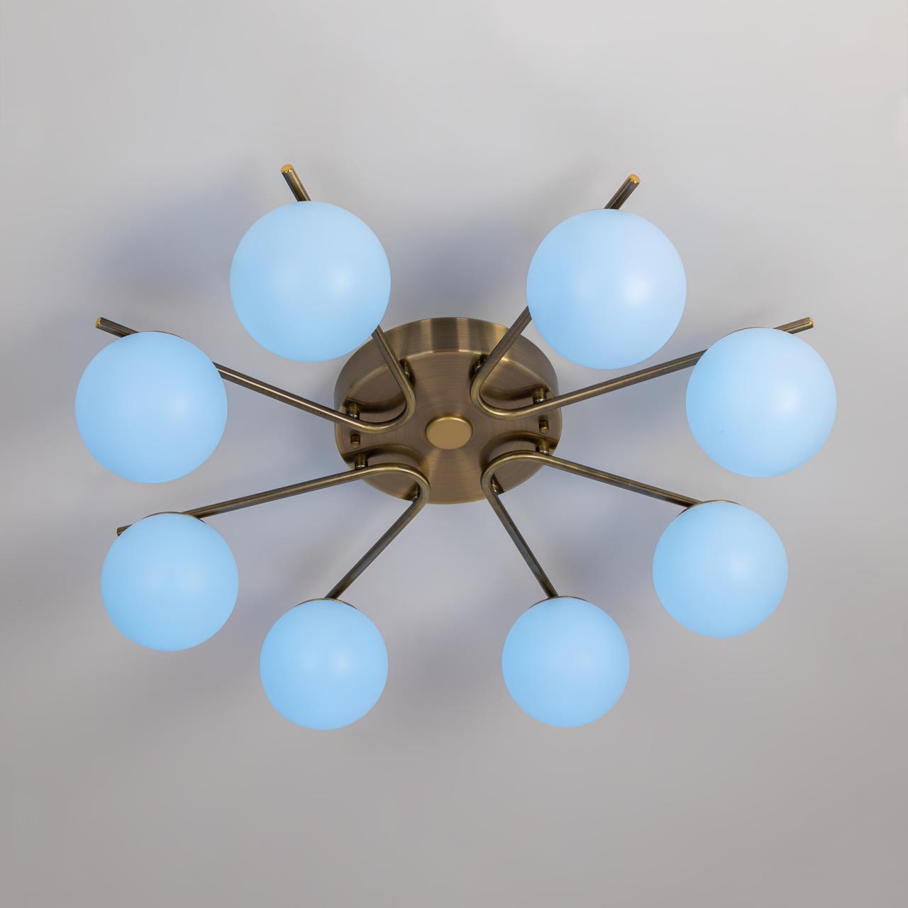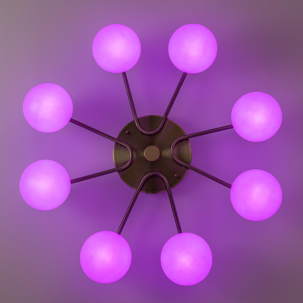 Люстра восьмирожковая с круглым основанием, корпус металлический, цвет бронза. Плафоны в форме шара, изготовлены из матового оптического полимера. Внутри каждого плафона расположена уникальная светодиодная панель, обеспечивающая яркое основное освещение или красочную RGB подсветку, с плавной регулировкой яркости во всех режимах света.