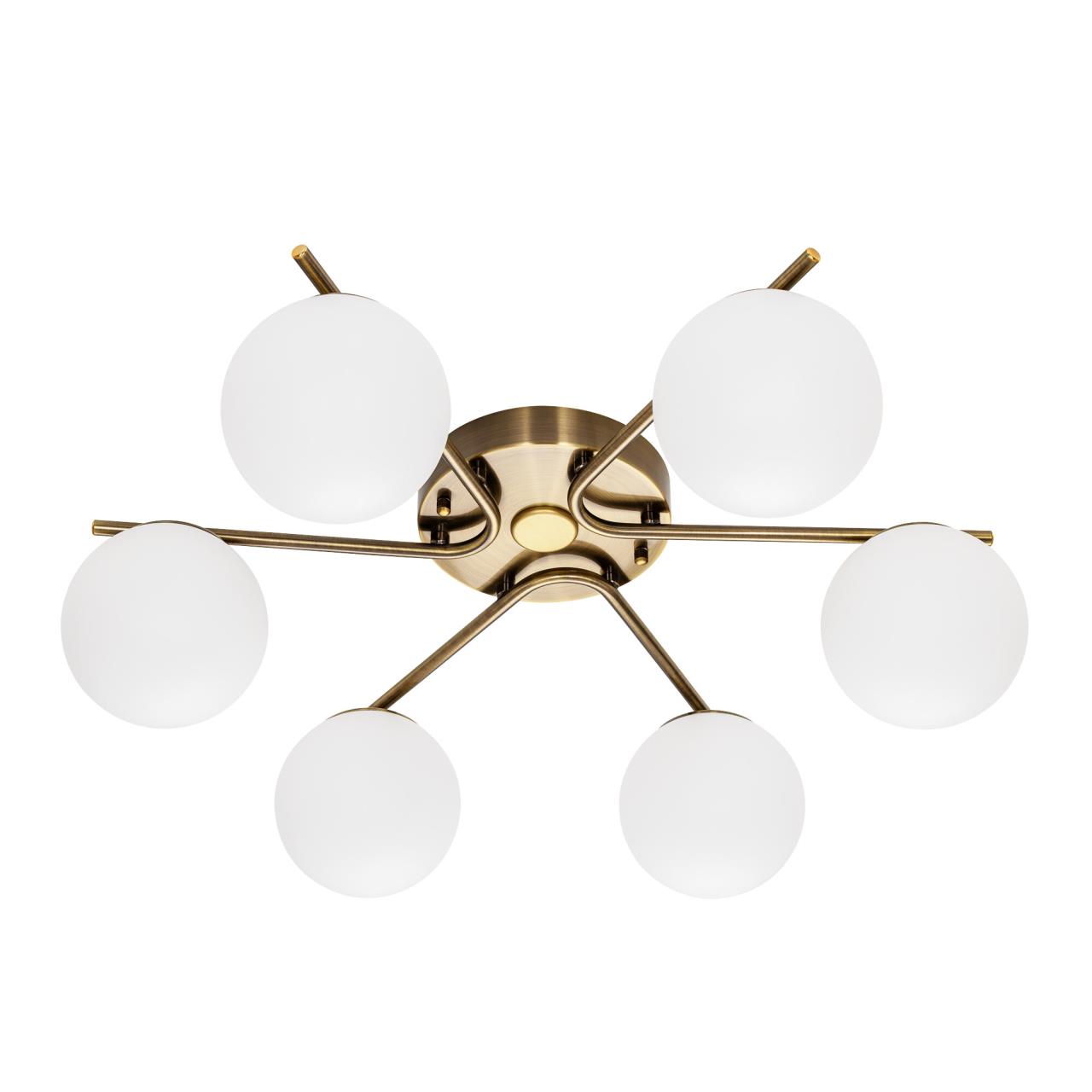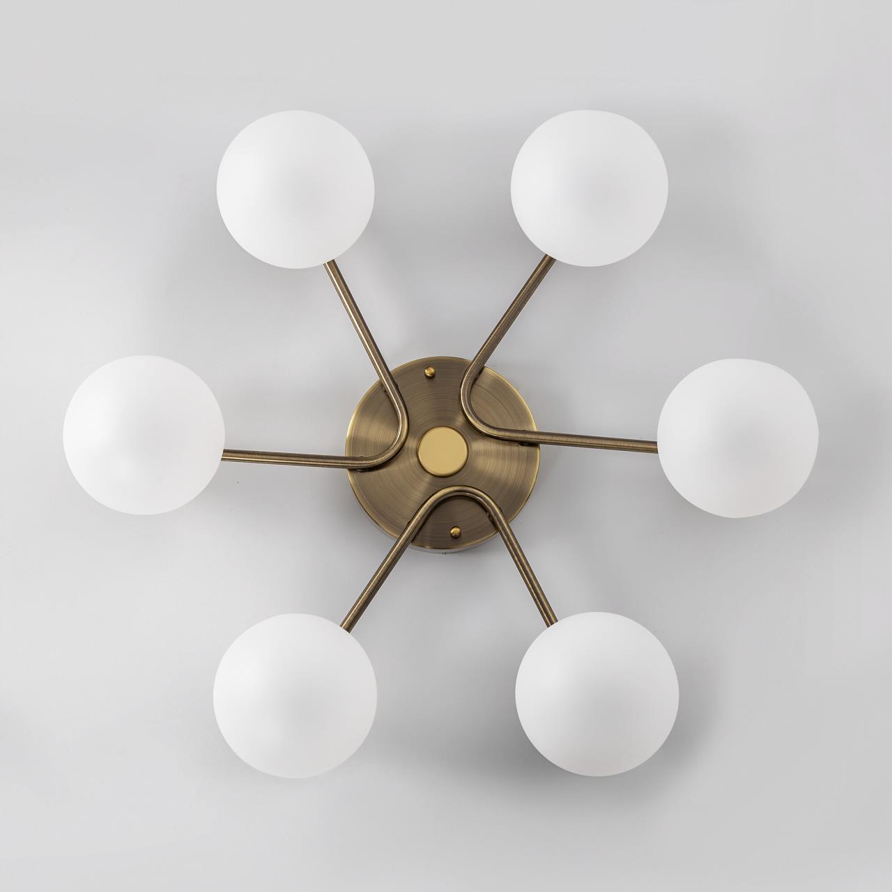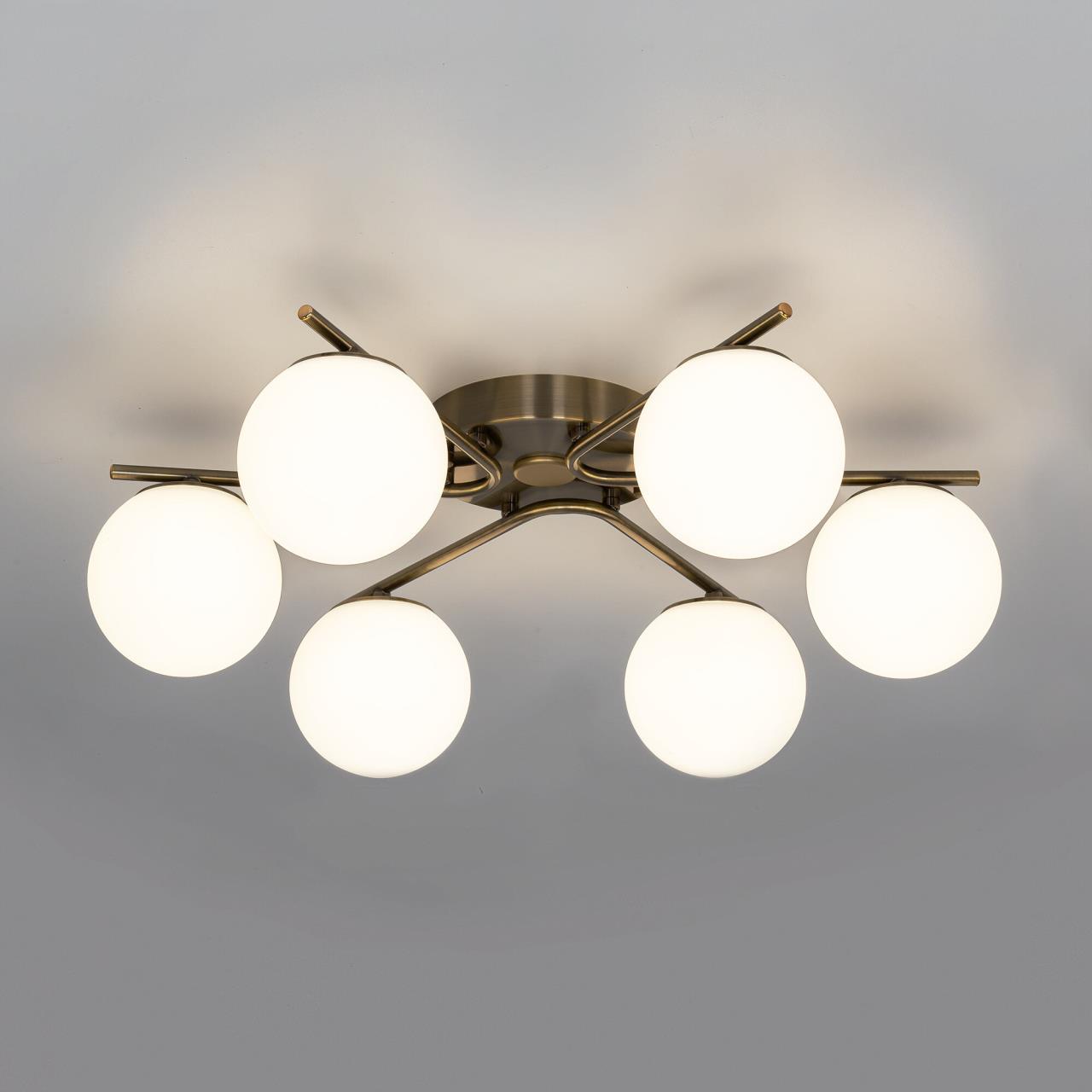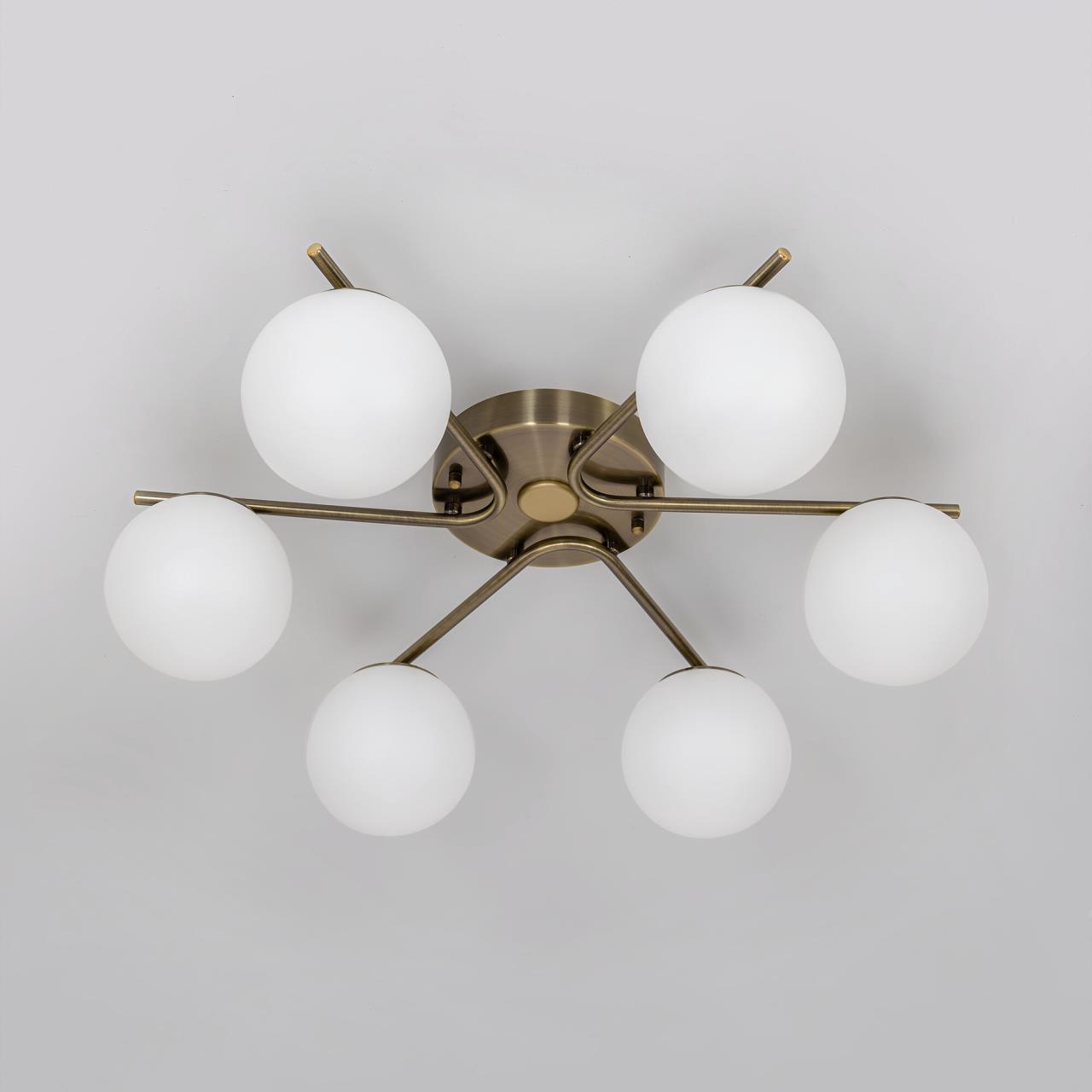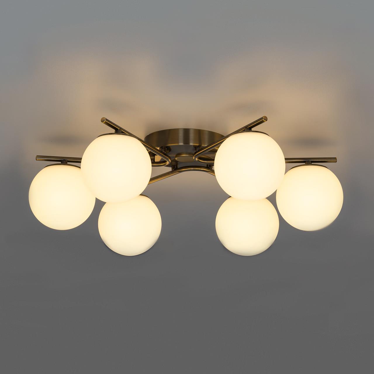 Люстра шестирожковая с круглым основанием. Корпус металлический, цвет - благородная бронза. Плафоны в форме шара, изготовлены из матового оптического полимера. Внутри каждого плафона расположена уникальная светодиодная панель, обеспечивающая яркое основное освещение или красочную RGB подсветку, с плавной регулировкой яркости во всех режимах света.
