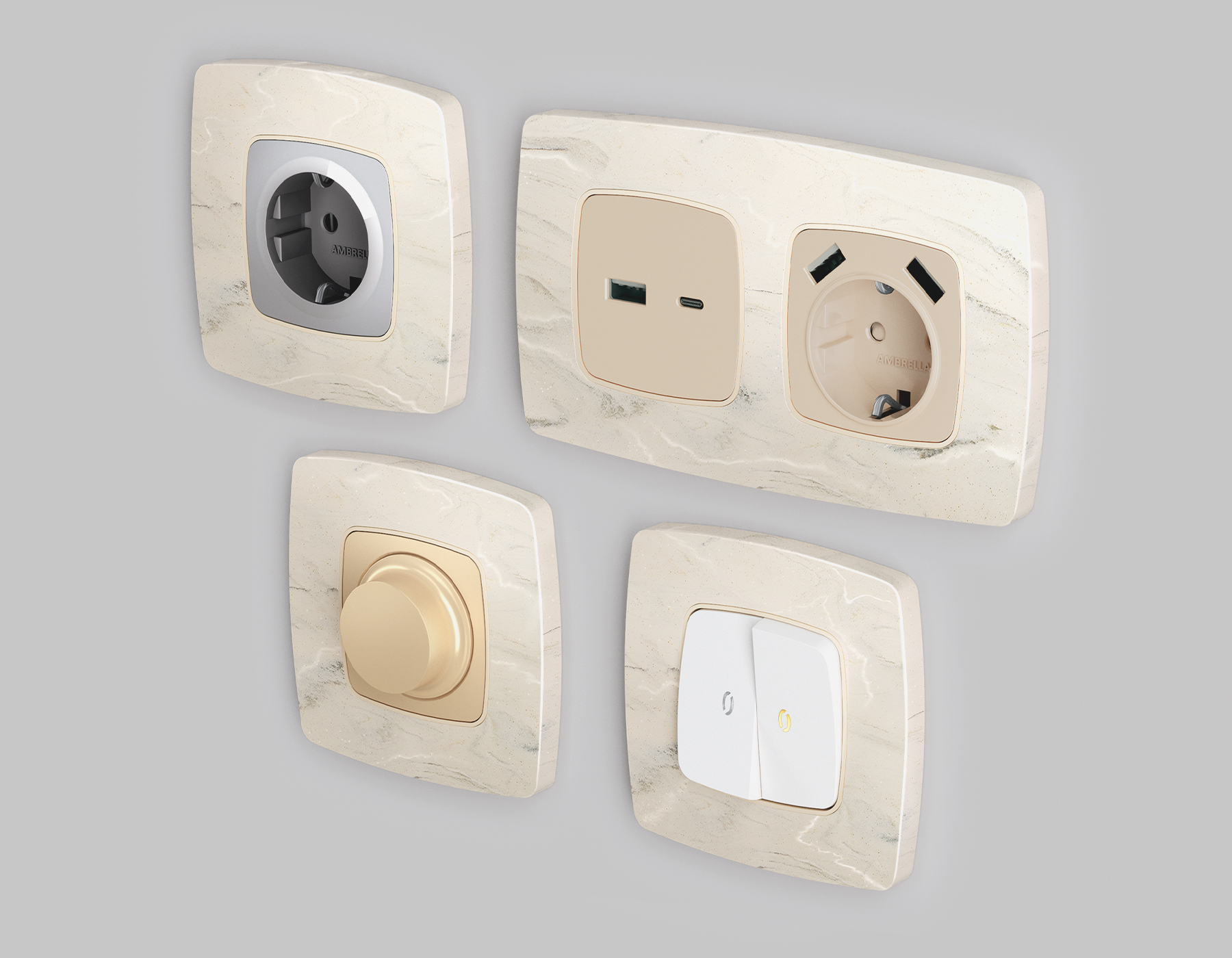 Многогранный ассортимент Ambrella Volt включает в себя механизмы, лицевые панели и рамки, а также комплекты, доступные в различных цветовых решениях. Продукция представлена в модульном исполнении, что позволяет гибко настраивать внешнийвид и функциональность. Вам будет легко заменить лицевую панель, рамку или механизм, найдя идеальное сочетание цветов.
