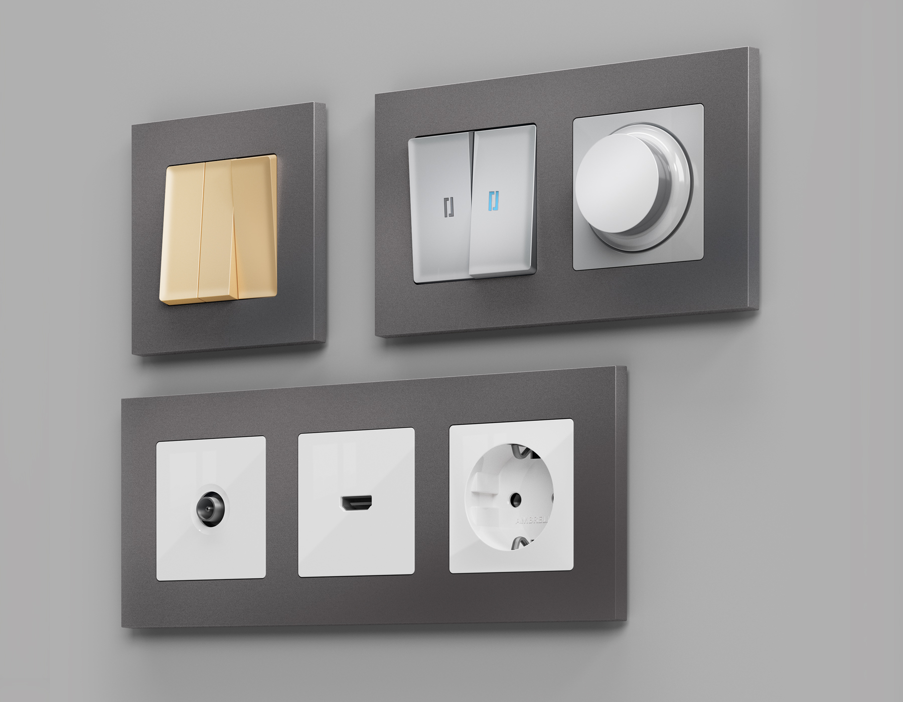 Многогранный ассортимент Ambrella Volt включает в себя механизмы, лицевые панели и рамки, а также комплекты, доступные в различных цветовых решениях. Продукция представлена в модульном исполнении, что позволяет гибко настраивать внешнийвид и функциональность. Вам будет легко заменить лицевую панель, рамку или механизм, найдя идеальное сочетание цветов.
