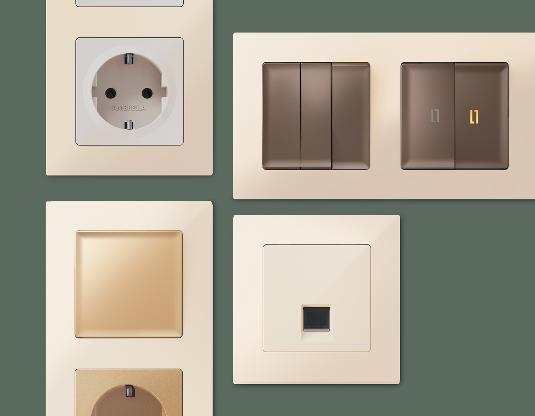 Многогранный ассортимент Ambrella Volt включает в себя механизмы, лицевые панели и рамки, а также комплекты, доступные в различных цветовых решениях. Продукция представлена в модульном исполнении, что позволяет гибко настраивать внешнийвид и функциональность. Вам будет легко заменить лицевую панель, рамку или механизм, найдя идеальное сочетание цветов.