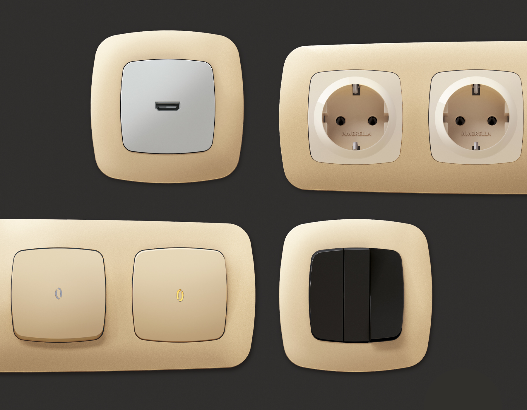 Многогранный ассортимент Ambrella Volt включает в себя механизмы, лицевые панели и рамки, а также комплекты, доступные в различных цветовых решениях. Продукция представлена в модульном исполнении, что позволяет гибко настраивать внешнийвид и функциональность. Вам будет легко заменить лицевую панель, рамку или механизм, найдя идеальное сочетание цветов.