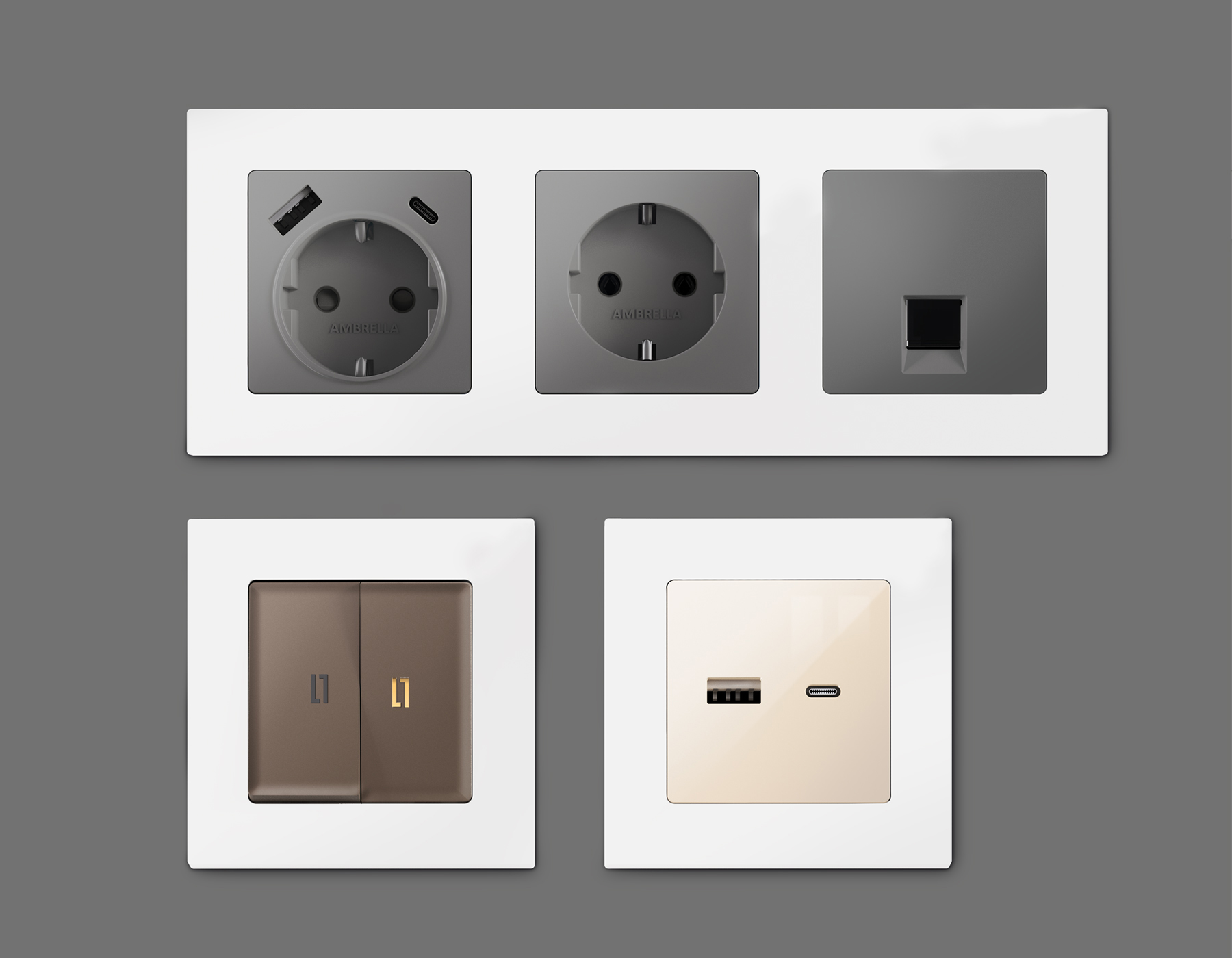 Многогранный ассортимент Ambrella Volt включает в себя механизмы, лицевые панели и рамки, а также комплекты, доступные в различных цветовых решениях. Продукция представлена в модульном исполнении, что позволяет гибко настраивать внешнийвид и функциональность. Вам будет легко заменить лицевую панель, рамку или механизм, найдя идеальное сочетание цветов.