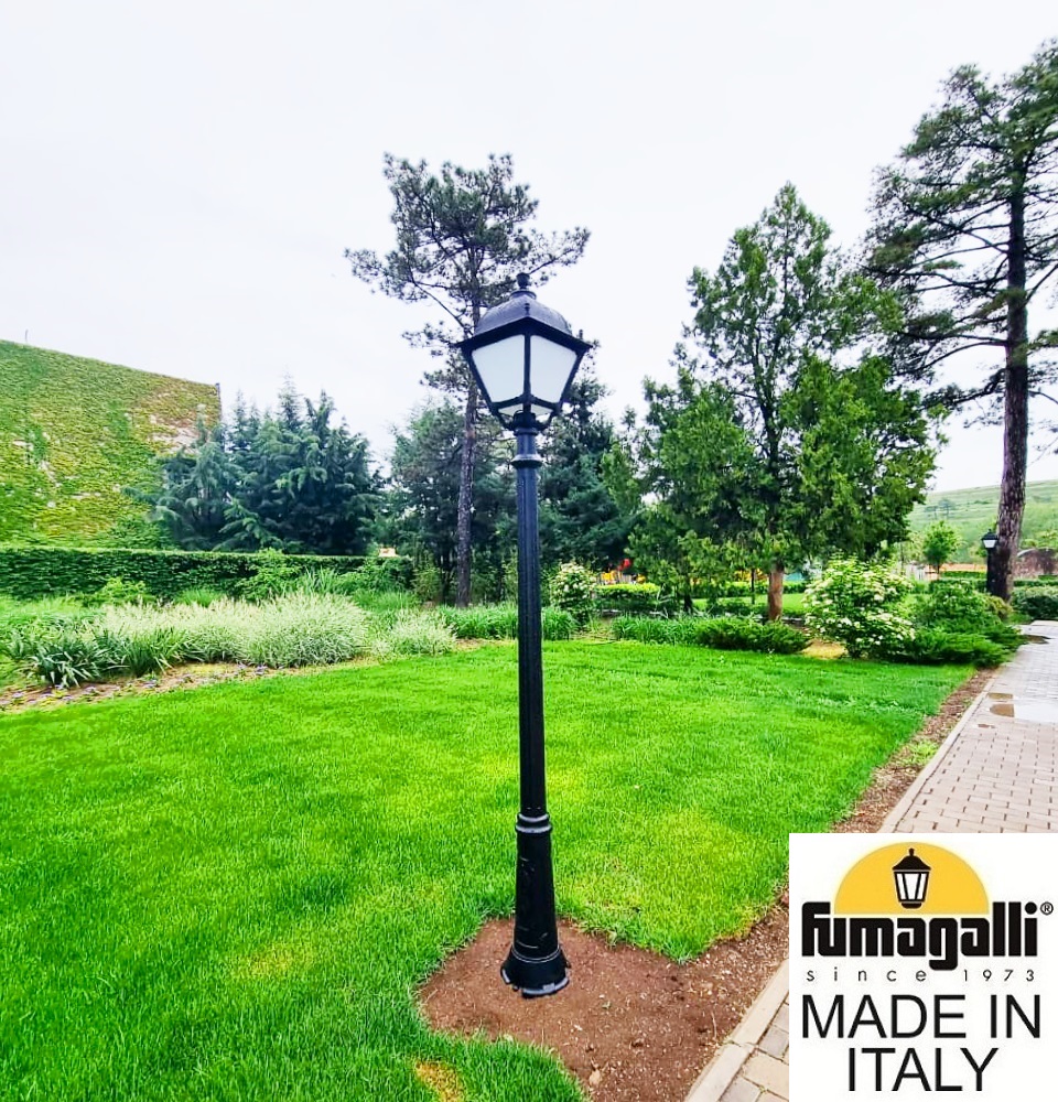 Садово-парковый фонарь FUMAGALLI среднего размера серии SIMON, модель RICU/SIMON. Парковый фонарь с 1 венчающим светильником большого размера в на классическом столбе RICU высотой 2,0 м (+высота фонаря). Предназначен для освещения парковых дорожек, cкверов, садовых и ландшафтных композиций, и других общественных пространств. Используется в качестве основного уличного освещения на городских улицах и площадях. Изготовлены в Италии, по уникальным технологиям "FUMATECH" из современного композитного полимера RESIN. Этот материал в 5 раз прочнее металла, не ржавеет, не окисляется, не выгорает на солнце, его не нужно красить. Все светильники пыле-влаго защищены по стандарту IP55 (Пылезащищенные, защита от водяных струй с любого направления). Рассеиватель выполнен из антивандального, не мутнеющего и не горючего PMMA (ПолиМетилМетаАкрилат). Срок службы светильника - не менее 20 лет. Температура использования от -60 до +90. В серии SIMON есть садовые фонари в настенном (OFIR/SIMON, MIRRA/SIMON) подвесном (SICHEM/SIMON) и наземном исполнении (IAFAET.R/SIMON, ALOE.R/SIMON, ARTU/SIMON, GIGI/SIMON, RICU/SIMON, NEBO/OFIR/SIMON 1L, NEBO/OFIR/SIMON 2L, TABOR/ADAM/SIMON 3L) со столбами разной высоты, с разным количеством и конфигурацией голов. Консоли настенных фонарей и кронштейны светильников на столбах освещения могут устанавливаться в положение вверх и вниз. Столбы выше 150 см имеют в основе мощную стальную трубу с двойной оцинковкой. При заказе требуется выбрать цвет корпуса, цвет плафона и тип патрона (Е-27 или LED GX-53). Возможен светодиодный вариант. По стилю и дизайну серия уличных светильников SIMON похожа на светильники среднего размера серии CEFA. По размеру относится к большим парковым светильникам как серия NOEMI и GLOBE 400.