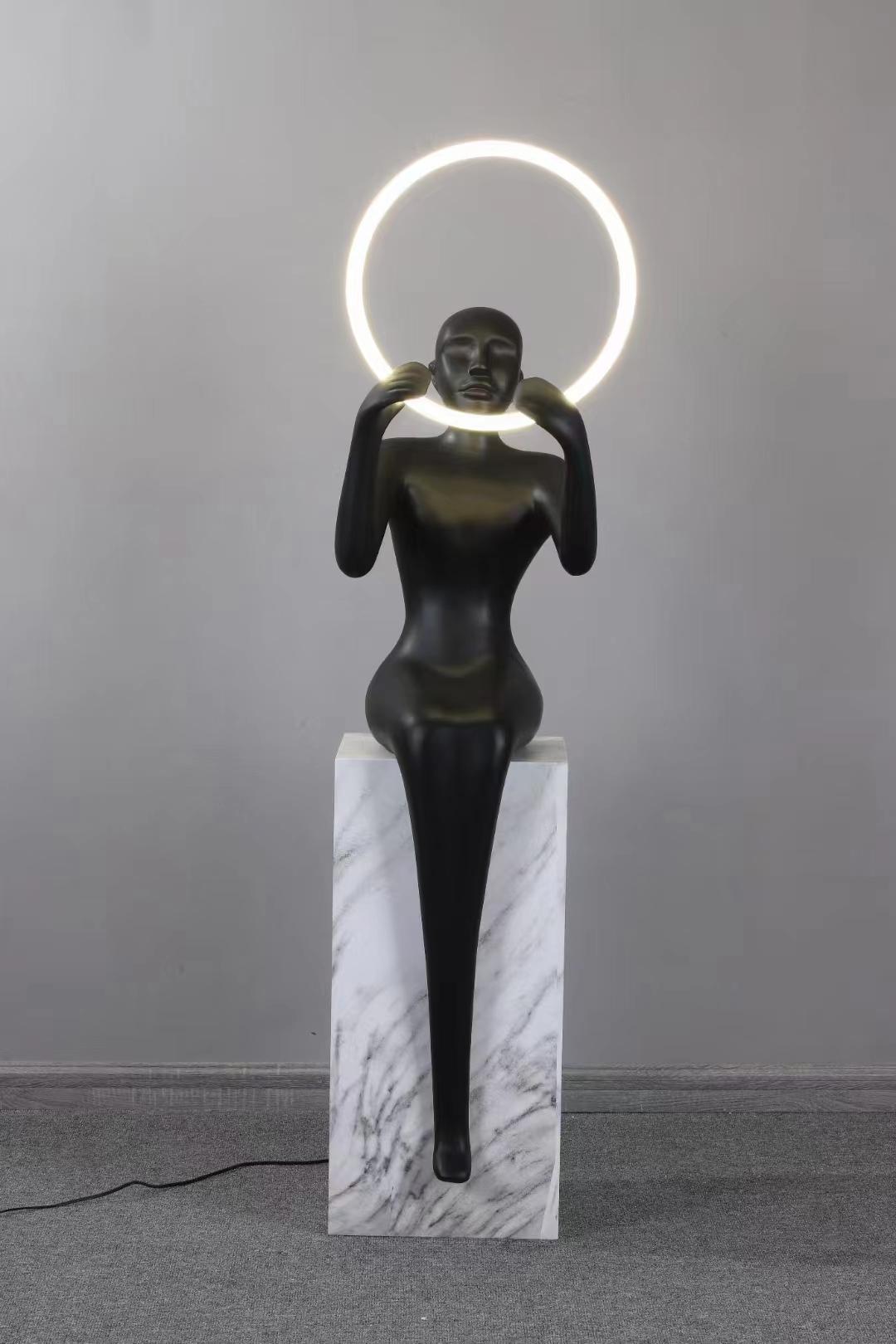 Торшер оснащен светодиодной лампой в форме кольца, которое держит фигура девушки. Акрил и металл, из которого выполнено изделие, обеспечивает высокую прочность и долговечность. Черный цвет основной фигуры контрастирует с белым плафоном, создавая эффектные линии и формы, которые делают эту модель стильным дополнением вашего домашнего интерьера.