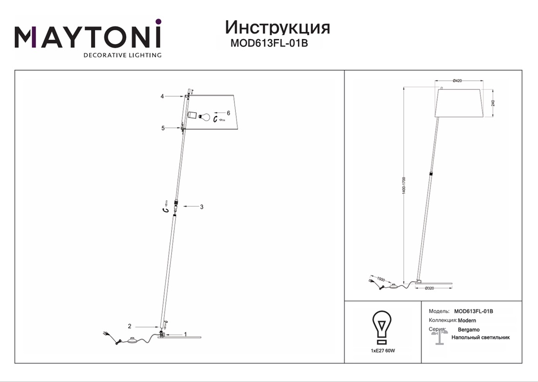 Торшер Maytoni Bergamo MOD613FL-01B — это модель, которая создана специально для любителей простых и функциональных интерьеров. Благодаря источнику света с типом цоколя E27 и мощностью 60 Вт, этот осветительный прибор обеспечивает комфортное и равномерное освещение на площади в 3 квадратных метра, создавая уютную атмосферу в вашем доме.