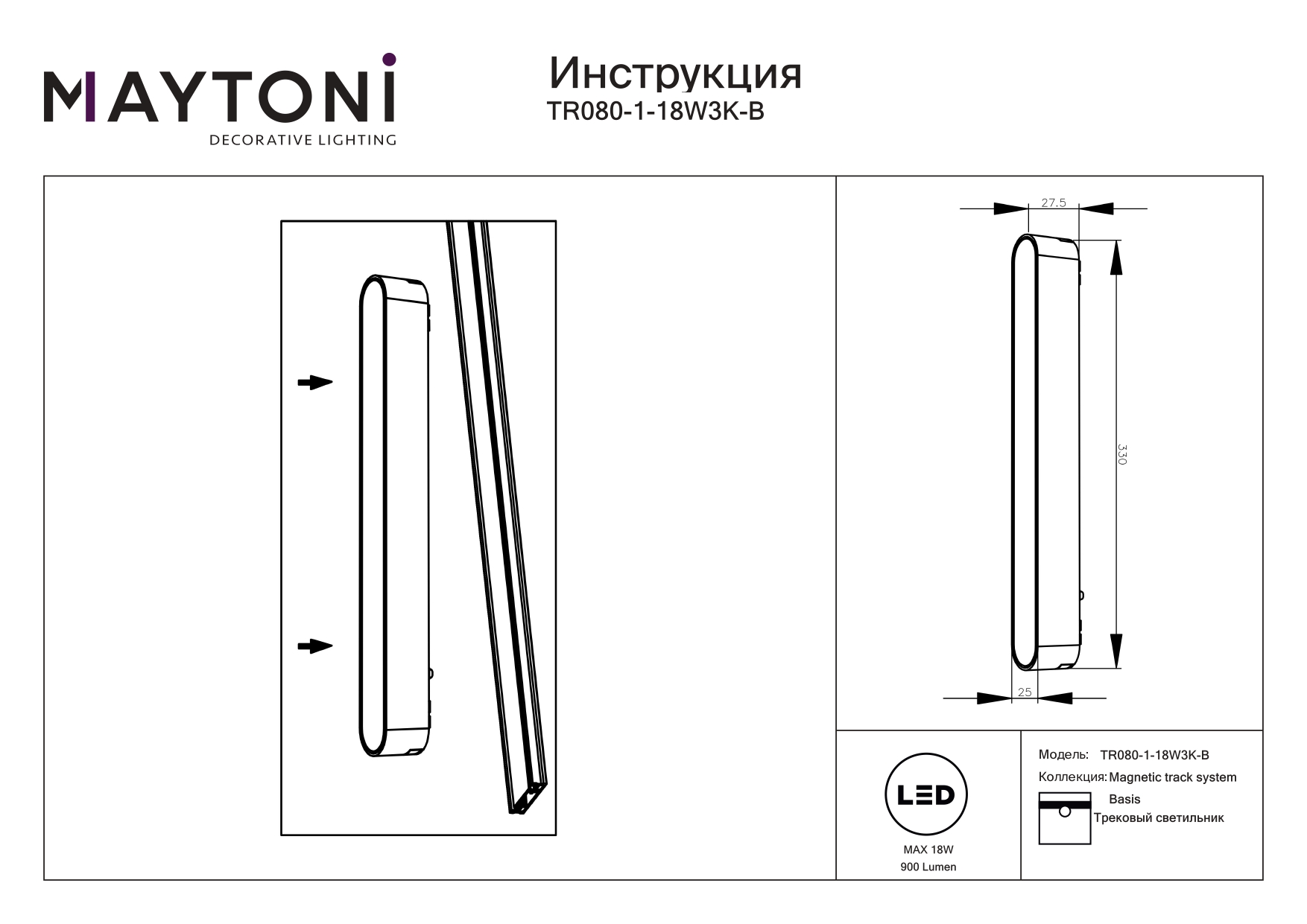 Купить "Трековый магнитный светильник Maytoni Basis TR080-1-18W3K-B"