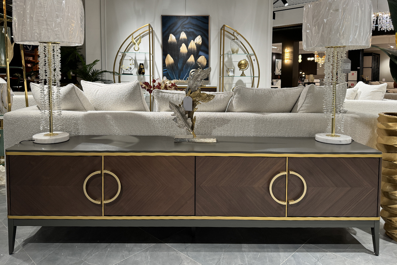 Тумба под телевизор в отделке тёмным шпоном — выразительное решение для интерьера с продуманной геометрией и благородным характером. Глубокий древесный рисунок фасадов подчеркнут тонким кантом и эффектными кольцевыми ручками, создающими ощущение современной классики. Чёткие линии корпуса уравновешены лёгкими опорами, благодаря чему модель выглядит визуально стройно и дорого. Вместительная тумба под телевизор с распашными дверцами помогает аккуратно организовать хранение техники и аксессуаров. Тумба под TV 4-х дверная из коллекции "ШПОН". Коллекция "ШПОН" является авторской разработкой студии Garda Studio, в стиле ар-деко.Габариты тумбы:ширина-200см, глубина-58см, высота-40см. Фасады коллекции "ШПОН" облицованы шпоном под цвет "Американский орех", украшены объемными полукруглыми ручками цвета "матовое золото"(ручки-металл) и декоративными элементами из массива бука под цвет "матовое золото". В состав коллекции так же входит: тумба прикроватная-арт.151SV-10001; консоль-арт.151SV-10002