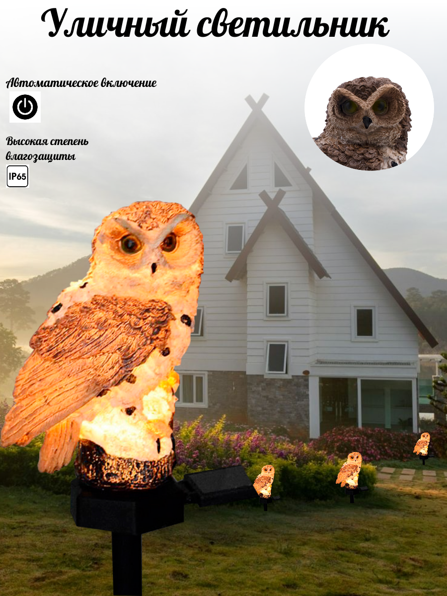 Дизайн выполнен из высококачественного абс- пластика и полистоуна, устойчивого к атмосферным воздействиям. Цветовая температура светильника составит 2700К . Перья совы детально проработаны, а глаза выполнены из светопропускающего материала, создавая мягкий, уютный свет.