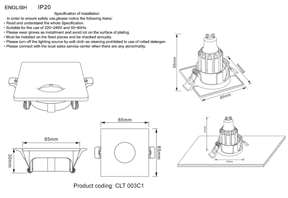 - Диаметр врезного отверстия: 75 мм (7.5 см)